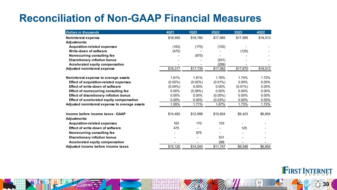 Reconciliation of Non-GAAP Financial Measures 29 1 Assuming a 21% tax rate Dollars in thousands 4Q21 1Q22 2Q22 3Q22 4Q22 Net interest margin 2.30% 2.56% 2.60% 2.40% 2.09% Adjustments: Effect of income from tax refund advance loans 0.00% (0.28%) (0.02%) 0.00% 0.00% Adjusted net interest margin 2.30% 2.28% 2.58% 2.40% 2.09% Net interest margin 2.30% 2.56% 2.60% 2.40% 2.09% Adjustments: Effect of fully-taxable equivalent adjustments 1 0.13% 0.13% 0.14% 0.13% 0.13% Effect of income from tax refund advance loans 0.00% (0.28%) (0.02%) 0.00% 0.00% Adjusted net interest margin - FTE 2.43% 2.41% 2.72% 2.53% 2.22% Provision (benefit) for loan losses (238)$ 791$ 1,185$ 892$ 2,109$ Adjustments: Provision for tax refund advance loans losses - (1,842) (18) - - Provision (benefit) for loan losses, excluding tax refund advance loans (238)$ (1,051)$ 1,167$ 892$ 2,109$ Average loans 2,914,858 2,947,924 2,998,144 3,161,850 3,382,212 Adjustments: Average tax refund advance loans - (60,499) (3,185) - - Average loans, excluding tax refund advance loans 2,914,858 2,887,425 2,994,959 3,161,850 3,382,212 Net charge-offs (recoveries) to average loans (0.01%) 0.05% 0.04% 0.02% 0.03% Adjustments: Effect of tax refund advance loans net charge-offs to average loans 0.00% (0.21%) (0.05%) 0.00% 0.00% Net charge-offs (recoveries) to average loans, excluding tax refund advance loans (0.01%) (0.16%) (0.01%) 0.02% 0.03% Allowance for loan losses $27,841 $28,251 $29,153 $29,866 $31,737 Loans $2,887,662 $2,880,780 $3,082,127 $3,255,906 $3,499,401 Adjustments: PPP loans (3,152) (1,003) (194) - - Loans, excluding PPP loans $2,884,510 $2,879,777 $3,081,933 $3,255,906 $3,499,401 Allowance for loan losses to loans 0.96% 0.98% 0.95% 0.92% 0.91% Effect of PPP loans 0.01% 0.00% 0.00% 0.00% 0.00% Allowance for loan losses to loans, excluding PPP loans 0.97% 0.98% 0.95% 0.92% 0.91%
