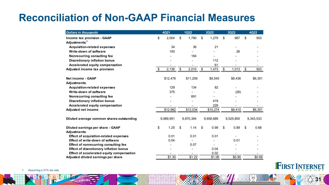 Reconciliation of Non-GAAP Financial Measures 30 Dollars in thousands 4Q21 1Q22 2Q22 3Q22 4Q22 Noninterest expense $16,955 $18,780 $17,985 $17,995 $18,513 Adjustments: Acquisition-related expenses (163) (170) (103) - - Write-down of software (475) - - (125) - Nonrecurring consulting fee - (875) - - - Discretionary inflation bonus - - (531) - - Accelerated equity compensation - - (289) - - Adjusted noninterest expense $16,317 $17,735 $17,062 $17,870 $18,513 Noninterest expense to average assets 1.61% 1.81% 1.76% 1.74% 1.72% Effect of acquisition-related expenses (0.02%) (0.02%) (0.01%) 0.00% 0.00% Effect of write-down of software (0.04%) 0.00% 0.00% (0.01%) 0.00% Effect of nonrecurring consulting fee 0.00% (0.08%) 0.00% 0.00% 0.00% Effect of discretionary inflation bonus 0.00% 0.00% (0.05%) 0.00% 0.00% Effect of accelerated equity compensation 0.00% 0.00% (0.03%) 0.00% 0.00% Adjusted noninterest expense to average assets 1.55% 1.71% 1.67% 1.73% 1.72% Income before income taxes - GAAP $14,482 $12,999 $10,824 $9,423 $6,854 Adjustments: Acquisition-related expenses 163 170 103 - - Effect of write-down of software 475 - - 125 - Nonrecurring consulting fee - 875 - - - Discretionary inflation bonus - - 531 - - Accelerated equity compensation - - 289 - - Adjusted income before income taxes $15,120 $14,044 $11,747 $9,548 $6,854