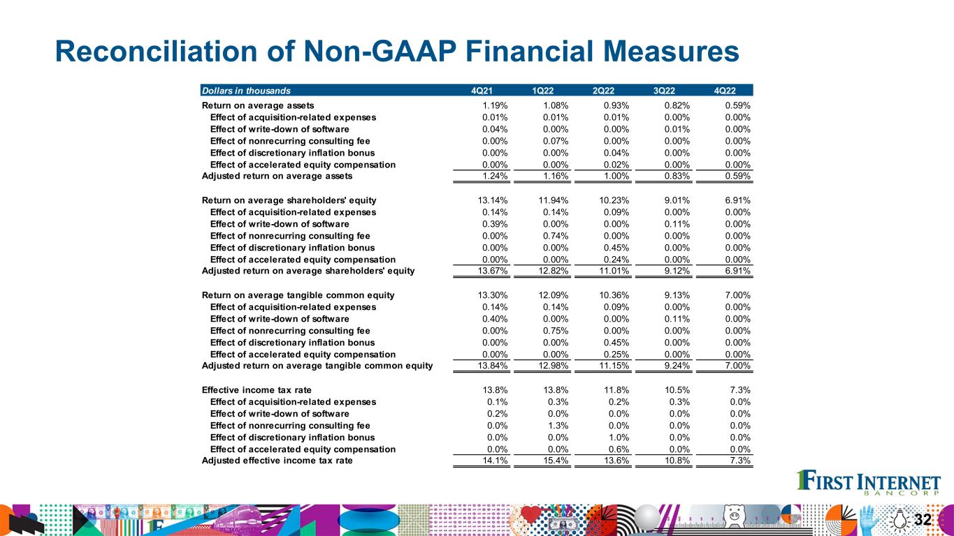 Reconciliation of Non-GAAP Financial Measures 31 1 Assuming a 21% tax rate Dollars in thousands 4Q21 1Q22 2Q22 3Q22 4Q22 Income tax provision - GAAP 2,004$ 1,790$ 1,279$ 987$ 503$ Adjustments:1 Acquisition-related expenses 34 36 21 - - Write-down of software 100 - - 26 - Nonrecurring consulting fee - 184 - - - Discretionary inflation bonus - - 112 - - Accelerated equity compensation - - 61 - - Adjusted income tax provision 2,138$ 2,010$ 1,473$ 1,013$ 503$ Net income - GAAP $12,478 $11,209 $9,545 $8,436 $6,351 Adjustments: Acquisition-related expenses 129 134 82 - - Write-down of software 375 - - (26) - Nonrecurring consulting fee - 691 - - - Discretionary inflation bonus - - 419 - - Accelerated equity compensation - - 228 - - Adjusted net income $12,982 $12,034 $10,274 $8,410 $6,351 Diluted average common shares outstanding 9,989,951 9,870,394 9,658,689 9,525,855 9,343,533 Diluted earnings per share - GAAP 1.25$ 1.14$ 0.99$ 0.89$ 0.68$ Adjustments: Effect of acquisition-related expenses 0.01 0.01 0.01 - - Effect of write-down of software 0.04 - - 0.01 - Effect of nonrecurring consulting fee - 0.07 - - - Effect of discretionary inflation bonus - - 0.04 - - Effect of accelerated equity compensation - - 0.02 - - Adjusted diluted earnings per share $1.30 $1.22 $1.06 $0.90 $0.68