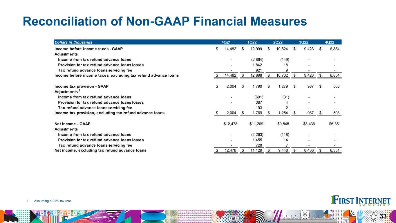 Reconciliation of Non-GAAP Financial Measures 32 Dollars in thousands 4Q21 1Q22 2Q22 3Q22 4Q22 Return on average assets 1.19% 1.08% 0.93% 0.82% 0.59% Effect of acquisition-related expenses 0.01% 0.01% 0.01% 0.00% 0.00% Effect of write-down of software 0.04% 0.00% 0.00% 0.01% 0.00% Effect of nonrecurring consulting fee 0.00% 0.07% 0.00% 0.00% 0.00% Effect of discretionary inflation bonus 0.00% 0.00% 0.04% 0.00% 0.00% Effect of accelerated equity compensation 0.00% 0.00% 0.02% 0.00% 0.00% Adjusted return on average assets 1.24% 1.16% 1.00% 0.83% 0.59% Return on average shareholders' equity 13.14% 11.94% 10.23% 9.01% 6.91% Effect of acquisition-related expenses 0.14% 0.14% 0.09% 0.00% 0.00% Effect of write-down of software 0.39% 0.00% 0.00% 0.11% 0.00% Effect of nonrecurring consulting fee 0.00% 0.74% 0.00% 0.00% 0.00% Effect of discretionary inflation bonus 0.00% 0.00% 0.45% 0.00% 0.00% Effect of accelerated equity compensation 0.00% 0.00% 0.24% 0.00% 0.00% Adjusted return on average shareholders' equity 13.67% 12.82% 11.01% 9.12% 6.91% Return on average tangible common equity 13.30% 12.09% 10.36% 9.13% 7.00% Effect of acquisition-related expenses 0.14% 0.14% 0.09% 0.00% 0.00% Effect of write-down of software 0.40% 0.00% 0.00% 0.11% 0.00% Effect of nonrecurring consulting fee 0.00% 0.75% 0.00% 0.00% 0.00% Effect of discretionary inflation bonus 0.00% 0.00% 0.45% 0.00% 0.00% Effect of accelerated equity compensation 0.00% 0.00% 0.25% 0.00% 0.00% Adjusted return on average tangible common equity 13.84% 12.98% 11.15% 9.24% 7.00% Effective income tax rate 13.8% 13.8% 11.8% 10.5% 7.3% Effect of acquisition-related expenses 0.1% 0.3% 0.2% 0.3% 0.0% Effect of write-down of software 0.2% 0.0% 0.0% 0.0% 0.0% Effect of nonrecurring consulting fee 0.0% 1.3% 0.0% 0.0% 0.0% Effect of discretionary inflation bonus 0.0% 0.0% 1.0% 0.0% 0.0% Effect of accelerated equity compensation 0.0% 0.0% 0.6% 0.0% 0.0% Adjusted effective income tax rate 14.1% 15.4% 13.6% 10.8% 7.3%