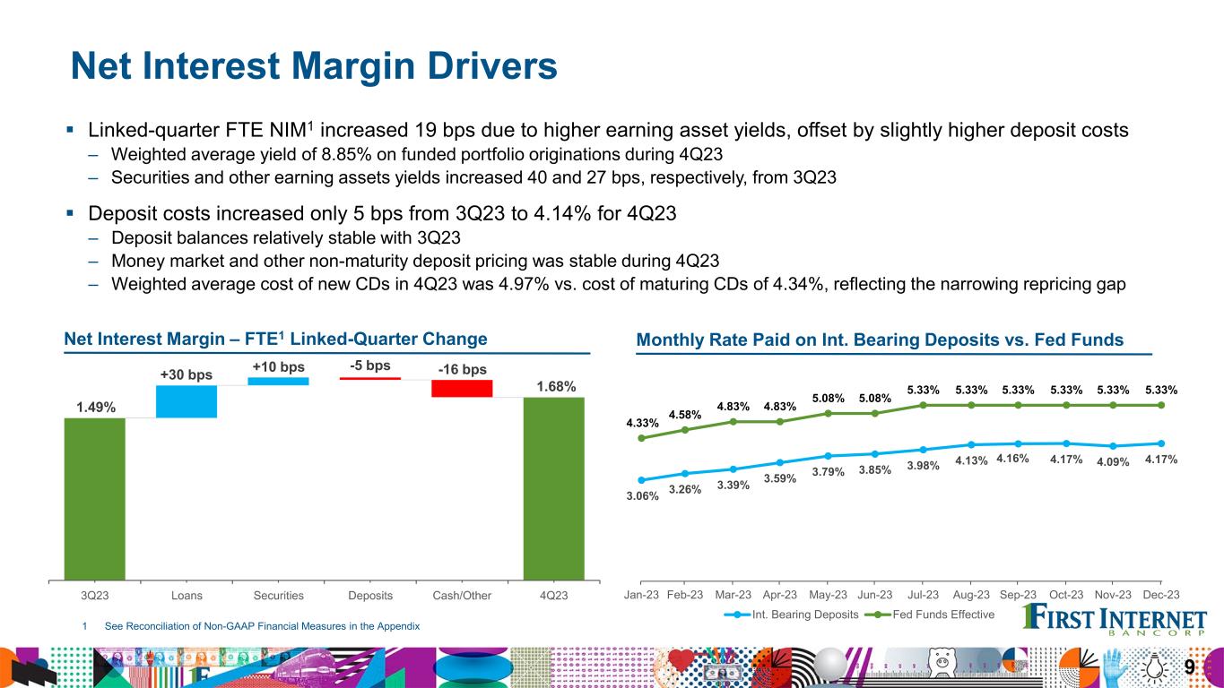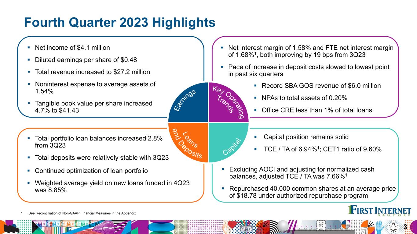Fourth Quarter 2023 Highlights  Net income of $4.1 million  Diluted earnings per share of $0.48 3  Net interest margin of 1.58% and FTE net interest margin of 1.68%1, both improving by 19 bps from 3Q23  Pace of increase in deposit costs slowed to lowest point in past six quarters  Capital position remains solid  TCE / TA of 6.94%1; CET1 ratio of 9.60%  Record SBA GOS revenue of $6.0 million  NPAs to total assets of 0.20%  Office CRE less than 1% of total loans  Excluding AOCI and adjusting for normalized cash balances, adjusted TCE / TA was 7.66%1  Repurchased 40,000 common shares at an average price of $18.78 under authorized repurchase program 1 See Reconciliation of Non-GAAP Financial Measures in the Appendix  Total revenue increased to $27.2 million  Noninterest expense to average assets of 1.54%  Tangible book value per share increased 4.7% to $41.43  Continued optimization of loan portfolio  Weighted average yield on new loans funded in 4Q23 was 8.85%  Total portfolio loan balances increased 2.8% from 3Q23  Total deposits were relatively stable with 3Q23