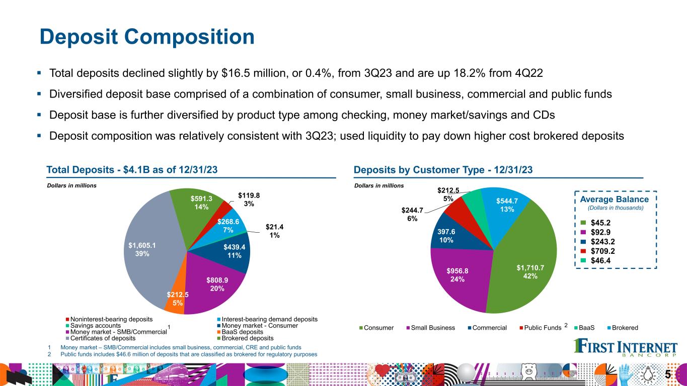 Loan Portfolio Overview  Total portfolio loan balances increased 2.8% from 3Q23  Commercial loan balances increased $97.7 million, or 3.4%, compared to 3Q23  Consumer loan balances increased $10.4 million, or 1.3%, compared to 3Q23  4Q23 funded portfolio loan origination yields were 8.85%, relatively stable with 3Q23 and up 278 bps from 4Q22  Office exposure continues to be less than 1% of total loan balances and is limited to suburban and medical 4 Loan Portfolio Mix1 1 Percentages may not add up to 100% due to rounding 2 Includes commercial and industrial and owner-occupied commercial real estate balances Dollars in millions 2 11% 10% 10% 10% 9% 9% 16% 16% 11% 8% 7% 12%3% 9% 1% 2% 4% 4% 4% 2% 4% 11% 17% 13% 8% 22% 26% 24% 20% 21% 18% 38% 34% 34% 31% 30% 27% 2% 2% 2% 4% 6% 8% 9% 7% 6% 6% 6% 5% $2,091 $2,716 $2,964 $3,059 $2,888 $3,499 $3,840 2017 2018 2019 2020 2021 2022 2023 Commercial and Industrial Construction and Investor CRE Single Tenant Lease Financing Public Finance Healthcare Finance Small Business Lending Franchise Finance Residential Mortgage/HE/HELOCs Consumer 5% 24% 10% 14% 6% 6% 11% 14% 10%