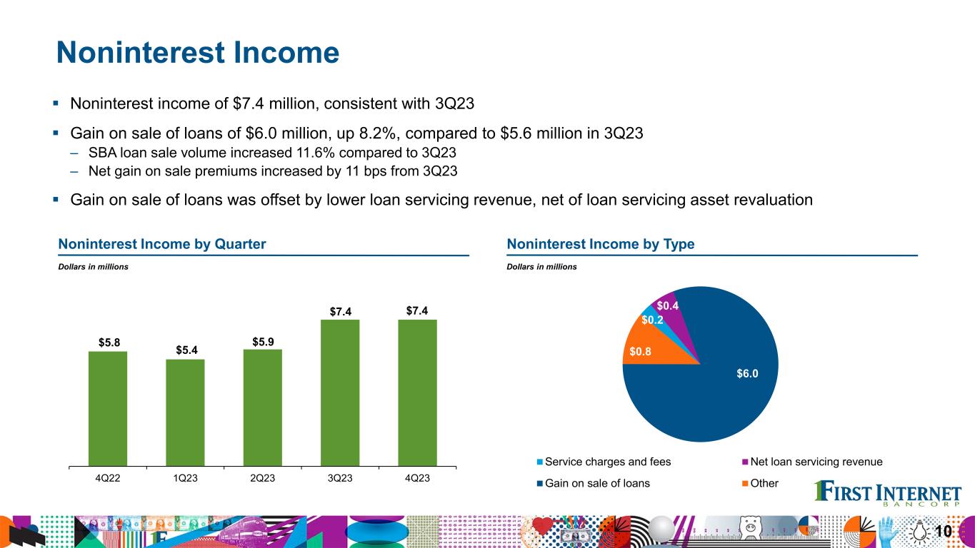 Net Interest Margin Drivers 9 1 See Reconciliation of Non-GAAP Financial Measures in the Appendix Net Interest Margin – FTE1 Linked-Quarter Change Monthly Rate Paid on Int. Bearing Deposits vs. Fed Funds  Linked-quarter FTE NIM1 increased 19 bps due to higher earning asset yields, offset by slightly higher deposit costs – Weighted average yield of 8.85% on funded portfolio originations during 4Q23 – Securities and other earning assets yields increased 40 and 27 bps, respectively, from 3Q23  Deposit costs increased only 5 bps from 3Q23 to 4.14% for 4Q23 – Deposit balances relatively stable with 3Q23 – Money market and other non-maturity deposit pricing was stable during 4Q23 – Weighted average cost of new CDs in 4Q23 was 4.97% vs. cost of maturing CDs of 4.34%, reflecting the narrowing repricing gap +30 bps -5 bps -16 bps 1.49% 1.68% +10 bps 3.06% 3.26% 3.39% 3.59% 3.79% 3.85% 3.98% 4.13% 4.16% 4.17% 4.09% 4.17% 4.33% 4.58% 4.83% 4.83% 5.08% 5.08% 5.33% 5.33% 5.33% 5.33% 5.33% 5.33% Jan-23 Feb-23 Mar-23 Apr-23 May-23 Jun-23 Jul-23 Aug-23 Sep-23 Oct-23 Nov-23 Dec-23 Int. Bearing Deposits Fed Funds Effective