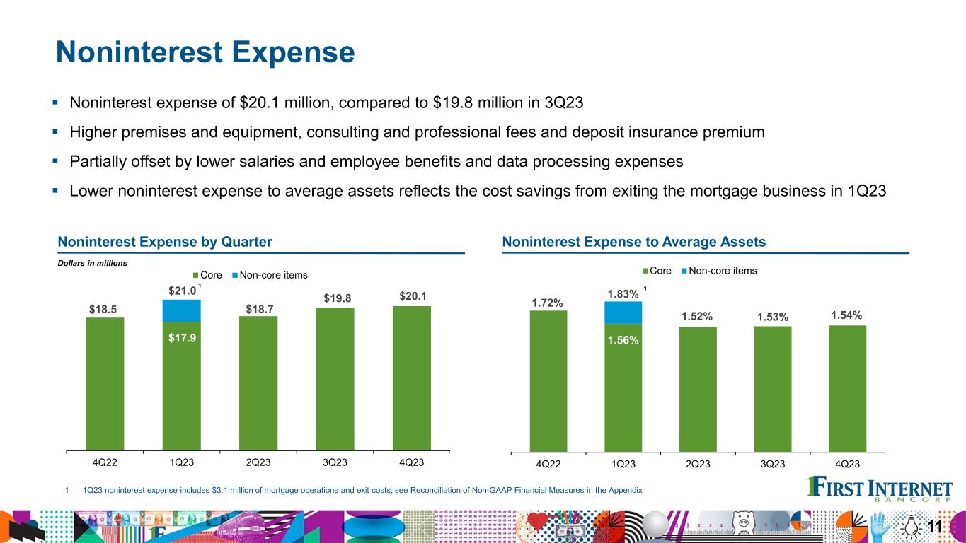 Noninterest Income 10 Dollars in millions Noninterest Income by Type Dollars in millions Noninterest Income by Quarter  Noninterest income of $7.4 million, consistent with 3Q23  Gain on sale of loans of $6.0 million, up 8.2%, compared to $5.6 million in 3Q23 – SBA loan sale volume increased 11.6% compared to 3Q23 – Net gain on sale premiums increased by 11 bps from 3Q23  Gain on sale of loans was offset by lower loan servicing revenue, net of loan servicing asset revaluation $0.2 $0.4 $6.0 $0.8 Service charges and fees Net loan servicing revenue Gain on sale of loans Other $5.8 $5.4 $5.9 $7.4 $7.4 4Q22 1Q23 2Q23 3Q23 4Q23