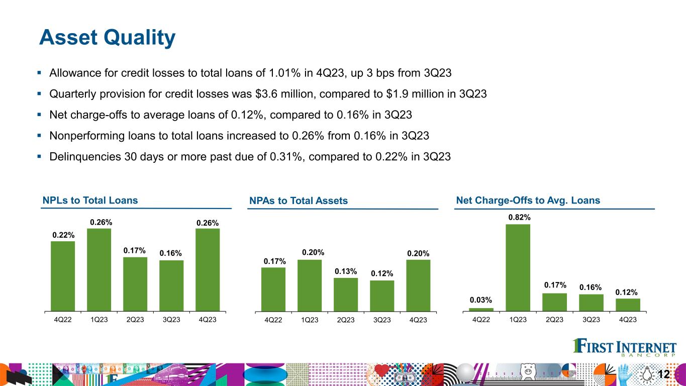 Noninterest Expense 11 1 1Q23 noninterest expense includes $3.1 million of mortgage operations and exit costs; see Reconciliation of Non-GAAP Financial Measures in the Appendix Dollars in millions Noninterest Expense by Quarter Noninterest Expense to Average Assets 1.73%1.71% 1.55% 1.72% 1.83% 1.52% 1.53% 1.54% 4Q22 1Q23 2Q23 3Q23 4Q23 Core Non-core items 1 1.56% $18.5 $18.7 $19.8 $20.1 4Q22 1Q23 2Q23 3Q23 4Q23 Core Non-core items $17.9 $21.0 1  Noninterest expense of $20.1 million, compared to $19.8 million in 3Q23  Higher premises and equipment, consulting and professional fees and deposit insurance premium  Partially offset by lower salaries and employee benefits and data processing expenses  Lower noninterest expense to average assets reflects the cost savings from exiting the mortgage business in 1Q23