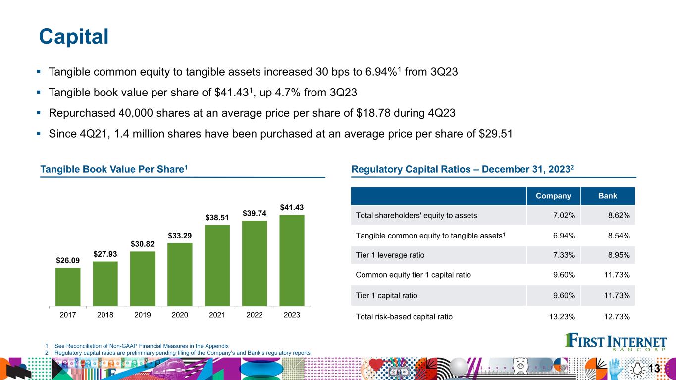 Asset Quality  Allowance for credit losses to total loans of 1.01% in 4Q23, up 3 bps from 3Q23  Quarterly provision for credit losses was $3.6 million, compared to $1.9 million in 3Q23  Net charge-offs to average loans of 0.12%, compared to 0.16% in 3Q23  Nonperforming loans to total loans increased to 0.26% from 0.16% in 3Q23  Delinquencies 30 days or more past due of 0.31%, compared to 0.22% in 3Q23 12 0.22% 0.26% 0.17% 0.16% 0.26% 4Q22 1Q23 2Q23 3Q23 4Q23 0.17% 0.20% 0.13% 0.12% 0.20% 4Q22 1Q23 2Q23 3Q23 4Q23 NPLs to Total Loans NPAs to Total Assets Net Charge-Offs to Avg. Loans 0.03% 0.82% 0.17% 0.16% 0.12% 4Q22 1Q23 2Q23 3Q23 4Q23