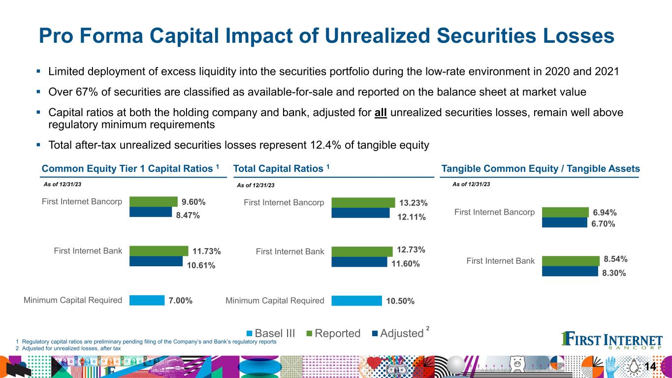 Pro Forma Capital Impact of Unrealized Securities Losses  Limited deployment of excess liquidity into the securities portfolio during the low-rate environment in 2020 and 2021  Over 67% of securities are classified as available-for-sale and reported on the balance sheet at market value  Capital ratios at both the holding company and bank, adjusted for all unrealized securities losses, remain well above regulatory minimum requirements  Total after-tax unrealized securities losses represent 12.4% of tangible equity 14 10.61% 8.47% 7.00% 11.73% 9.60% Minimum Capital Required First Internet Bank First Internet Bancorp 11.60% 12.11% 10.50% 12.73% 13.23% Minimum Capital Required First Internet Bank First Internet Bancorp Basel III Reported Adjusted 1 Regulatory capital ratios are preliminary pending filing of the Company’s and Bank’s regulatory reports 2 Adjusted for unrealized losses, after tax Common Equity Tier 1 Capital Ratios 1 Total Capital Ratios 1 Tangible Common Equity / Tangible Assets As of 12/31/23 As of 12/31/23 As of 12/31/23 8.30% 6.70% 8.54% 6.94% First Internet Bank First Internet Bancorp 2