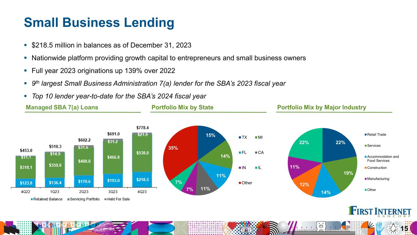 Small Business Lending  $218.5 million in balances as of December 31, 2023  Nationwide platform providing growth capital to entrepreneurs and small business owners  Full year 2023 originations up 139% over 2022  9th largest Small Business Administration 7(a) lender for the SBA’s 2023 fiscal year  Top 10 lender year-to-date for the SBA’s 2024 fiscal year 1315 Managed SBA 7(a) Loans Portfolio Mix by State Portfolio Mix by Major Industry 15% 14% 11% 11%7% 7% 35% TX MI FL CA IN IL Other 22% 19% 14% 12% 11% 22% Retail Trade Services Accommodation and Food Services Construction Manufacturing Other