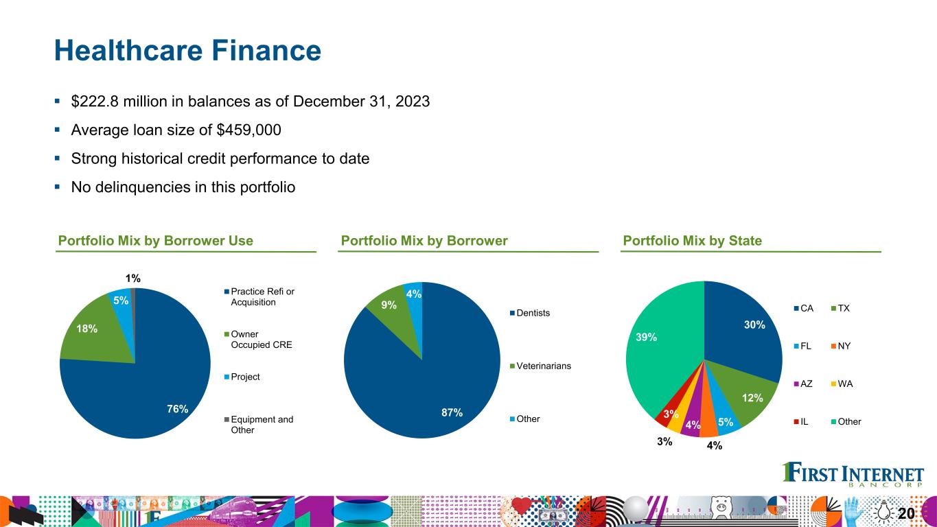 5% 10% 11% 5% 17% 9% 7% 3% 1% 32% AAA/Aaa AA+/Aa1 AA/Aa2 AA-/Aa3 A+/A1 A/A2 A-/A3 BBB+/Baa1 BBB/Baa2 Non-Rated 33% 14% 13% 10% 6% 6% 6% 3% 3% 2% 4% General Obligation Essential use equipment loans Lease rental revenue Water & sewer revenue Short term cash flow financing (BAN) Private Higher Education Tax Incremental Financing (TIF) districts Public higher education facilities Income Tax supported loans Sales tax, food and beverage tax, hotel tax Others 60% 6% 5% 4% 4% 4% 3% 2% 12% IN OK IA OH MO MI GA WA Other Public Finance  $521.8 million in balances as of December 31, 2023  Provides a range of credit solutions for government and not-for-profit entities  Borrowers’ needs include short-term financing, debt refinancing, infrastructure improvements, economic development and equipment financing 19  No delinquencies or losses since inception Portfolio Mix by Repayment Source Borrower Mix by Credit Rating Portfolio Mix by State