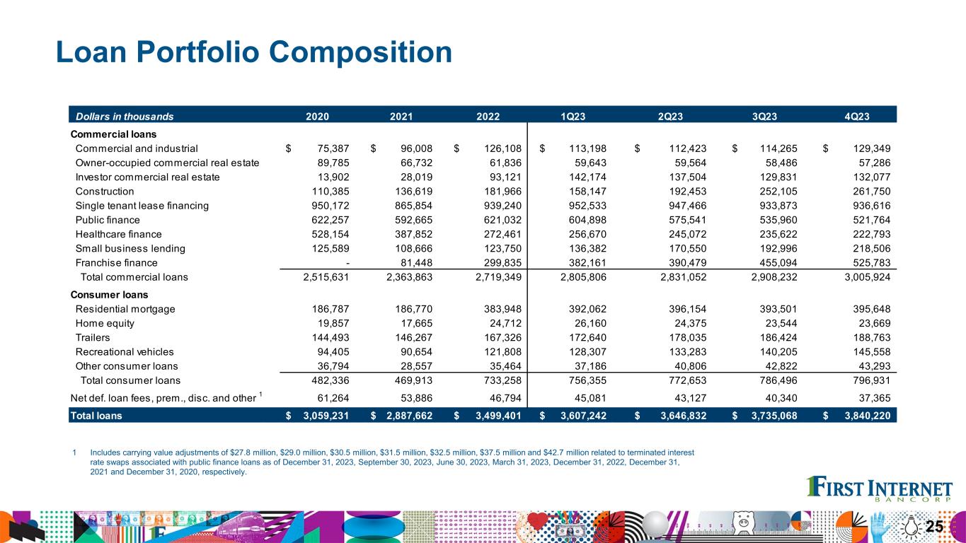 Residential Mortgage  $419.3 million in balances as of December 31, 2023 (includes home equity balances)  Historically direct-to-consumer originations centrally located at corporate headquarters  Focused on high quality borrowers – Average loan size of $208,000 – Average credit score at origination of 742 – Average LTV at origination of 80%  Strong historical credit performance 22 Concentration by State Concentration by Loan TypeNational Portfolio with Midwest Concentration 15% 3% 72% 5% 5% 22 70% 12% 2% 2% 2% 12% Indiana California Florida Texas New York All other states 92% 4%3% 1% Single Family Residential Home Equity – LOC SFR Construction to Permanent Home Equity – Closed End