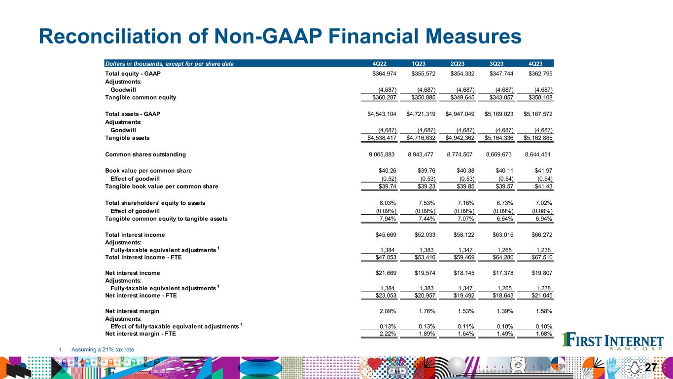 Reconciliation of Non-GAAP Financial Measures 26 Dollars in thousands, except for per share data 2017 2018 2019 2020 2021 2022 2023 Total equity - GAAP $224,127 $288,735 $304,913 $330,944 $380,338 $364,974 $362,795 Adjustments: Goodwill (4,687) (4,687) (4,687) (4,687) (4,687) (4,687) (4,687) Tangible common equity $219,440 $284,048 $300,226 $326,257 $375,651 $360,287 $358,108 Common shares outstanding 8,411,077 10,170,778 9,741,800 9,800,569 9,754,455 9,065,883 8,644,451 Book value per common share $26.65 $28.39 $31.30 $33.77 $38.99 $40.26 $41.97 Effect of goodwill (0.56) (0.46) (0.48) (0.48) (0.48) (0.52) (0.54) Tangible book value per common share $26.09 $27.93 $30.82 $33.29 $38.51 $39.74 $41.43