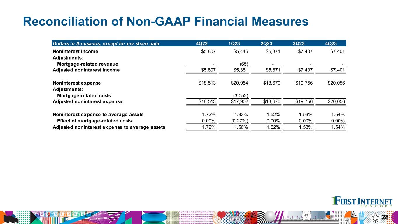 Reconciliation of Non-GAAP Financial Measures 27 1 Assuming a 21% tax rate Dollars in thousands, except for per share data 4Q22 1Q23 2Q23 3Q23 4Q23 Total equity - GAAP $364,974 $355,572 $354,332 $347,744 $362,795 Adjustments: Goodwill (4,687) (4,687) (4,687) (4,687) (4,687) Tangible common equity $360,287 $350,885 $349,645 $343,057 $358,108 Total assets - GAAP $4,543,104 $4,721,319 $4,947,049 $5,169,023 $5,167,572 Adjustments: Goodwill (4,687) (4,687) (4,687) (4,687) (4,687) Tangible assets $4,538,417 $4,716,632 $4,942,362 $5,164,336 $5,162,885 Common shares outstanding 9,065,883 8,943,477 8,774,507 8,669,673 8,644,451 Book value per common share $40.26 $39.76 $40.38 $40.11 $41.97 Effect of goodwill (0.52) (0.53) (0.53) (0.54) (0.54) Tangible book value per common share $39.74 $39.23 $39.85 $39.57 $41.43 Total shareholders' equity to assets 8.03% 7.53% 7.16% 6.73% 7.02% Effect of goodwill (0.09%) (0.09%) (0.09%) (0.09%) (0.08%) Tangible common equity to tangible assets 7.94% 7.44% 7.07% 6.64% 6.94% Total interest income $45,669 $52,033 $58,122 $63,015 $66,272 Adjustments: Fully-taxable equivalent adjustments 1 1,384 1,383 1,347 1,265 1,238 Total interest income - FTE $47,053 $53,416 $59,469 $64,280 $67,510 Net interest income $21,669 $19,574 $18,145 $17,378 $19,807 Adjustments: Fully-taxable equivalent adjustments 1 1,384 1,383 1,347 1,265 1,238 Net interest income - FTE $23,053 $20,957 $19,492 $18,643 $21,045 Net interest margin 2.09% 1.76% 1.53% 1.39% 1.58% Adjustments: Effect of fully-taxable equivalent adjustments 1 0.13% 0.13% 0.11% 0.10% 0.10% Net interest margin - FTE 2.22% 1.89% 1.64% 1.49% 1.68%