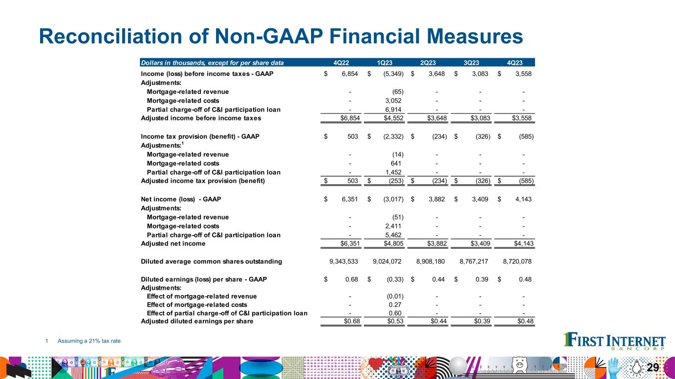 Reconciliation of Non-GAAP Financial Measures 28 Dollars in thousands, except for per share data 4Q22 1Q23 2Q23 3Q23 4Q23 Noninterest income $5,807 $5,446 $5,871 $7,407 $7,401 Adjustments: Mortgage-related revenue - (65) - - - Adjusted noninterest income $5,807 $5,381 $5,871 $7,407 $7,401 Noninterest expense $18,513 $20,954 $18,670 $19,756 $20,056 Adjustments: Mortgage-related costs - (3,052) - - - Adjusted noninterest expense $18,513 $17,902 $18,670 $19,756 $20,056 Noninterest expense to average assets 1.72% 1.83% 1.52% 1.53% 1.54% Effect of mortgage-related costs 0.00% (0.27%) 0.00% 0.00% 0.00% Adjusted noninterest expense to average assets 1.72% 1.56% 1.52% 1.53% 1.54%