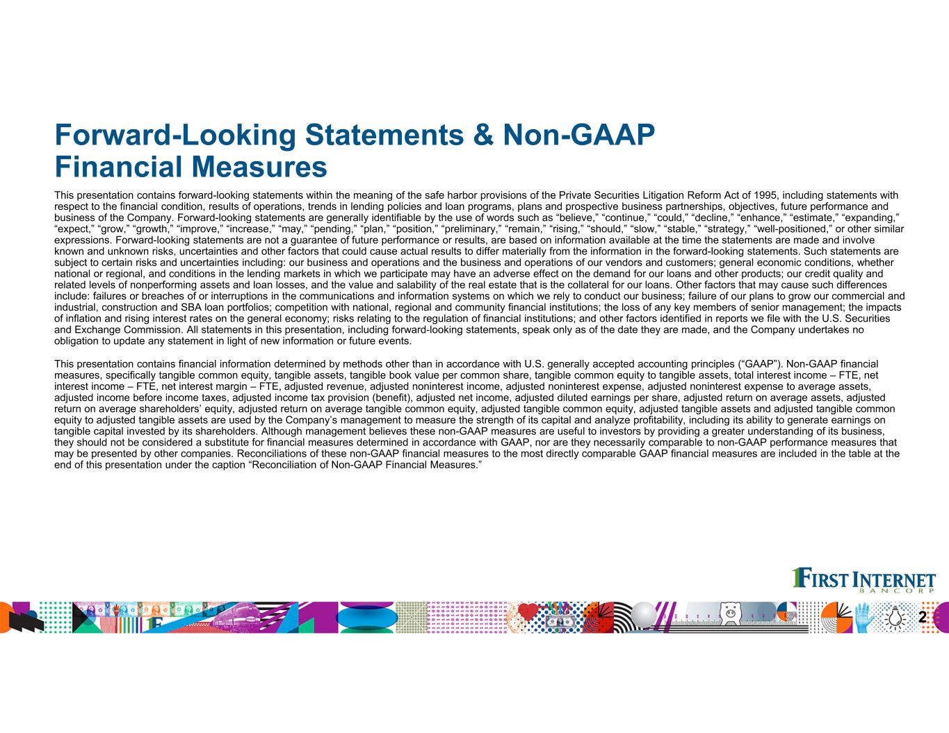 Forward-Looking Statements & Non-GAAP Financial Measures This presentation contains forward-looking statements within the meaning of the safe harbor provisions of the Private Securities Litigation Reform Act of 1995, including statements with respect to the financial condition, results of operations, trends in lending policies and loan programs, plans and prospective business partnerships, objectives, future performance and business of the Company. Forward-looking statements are generally identifiable by the use of words such as “believe,” “continue,” “could,” “decline,” “enhance,” “estimate,” “expanding,” “expect,” “grow,” “growth,” “improve,” “increase,” “may,” “pending,” “plan,” “position,” “preliminary,” “remain,” “rising,” “should,” “slow,” “stable,” “strategy,” “well-positioned,” or other similar expressions. Forward-looking statements are not a guarantee of future performance or results, are based on information available at the time the statements are made and involve known and unknown risks, uncertainties and other factors that could cause actual results to differ materially from the information in the forward-looking statements. Such statements are subject to certain risks and uncertainties including: our business and operations and the business and operations of our vendors and customers; general economic conditions, whether national or regional, and conditions in the lending markets in which we participate may have an adverse effect on the demand for our loans and other products; our credit quality and related levels of nonperforming assets and loan losses, and the value and salability of the real estate that is the collateral for our loans. Other factors that may cause such differences include: failures or breaches of or interruptions in the communications and information systems on which we rely to conduct our business; failure of our plans to grow our commercial and industrial, construction and SBA loan portfolios; competition with national, regional and community financial institutions; the loss of any key members of senior management; the impacts of inflation and rising interest rates on the general economy; risks relating to the regulation of financial institutions; and other factors identified in reports we file with the U.S. Securities and Exchange Commission. All statements in this presentation, including forward-looking statements, speak only as of the date they are made, and the Company undertakes no obligation to update any statement in light of new information or future events. This presentation contains financial information determined by methods other than in accordance with U.S. generally accepted accounting principles (“GAAP”). Non-GAAP financial measures, specifically tangible common equity, tangible assets, tangible book value per common share, tangible common equity to tangible assets, total interest income – FTE, net interest income – FTE, net interest margin – FTE, adjusted revenue, adjusted noninterest income, adjusted noninterest expense, adjusted noninterest expense to average assets, adjusted income before income taxes, adjusted income tax provision (benefit), adjusted net income, adjusted diluted earnings per share, adjusted return on average assets, adjusted return on average shareholders’ equity, adjusted return on average tangible common equity, adjusted tangible common equity, adjusted tangible assets and adjusted tangible common equity to adjusted tangible assets are used by the Company’s management to measure the strength of its capital and analyze profitability, including its ability to generate earnings on tangible capital invested by its shareholders. Although management believes these non-GAAP measures are useful to investors by providing a greater understanding of its business, they should not be considered a substitute for financial measures determined in accordance with GAAP, nor are they necessarily comparable to non-GAAP performance measures that may be presented by other companies. Reconciliations of these non-GAAP financial measures to the most directly comparable GAAP financial measures are included in the table at the end of this presentation under the caption “Reconciliation of Non-GAAP Financial Measures.” 2