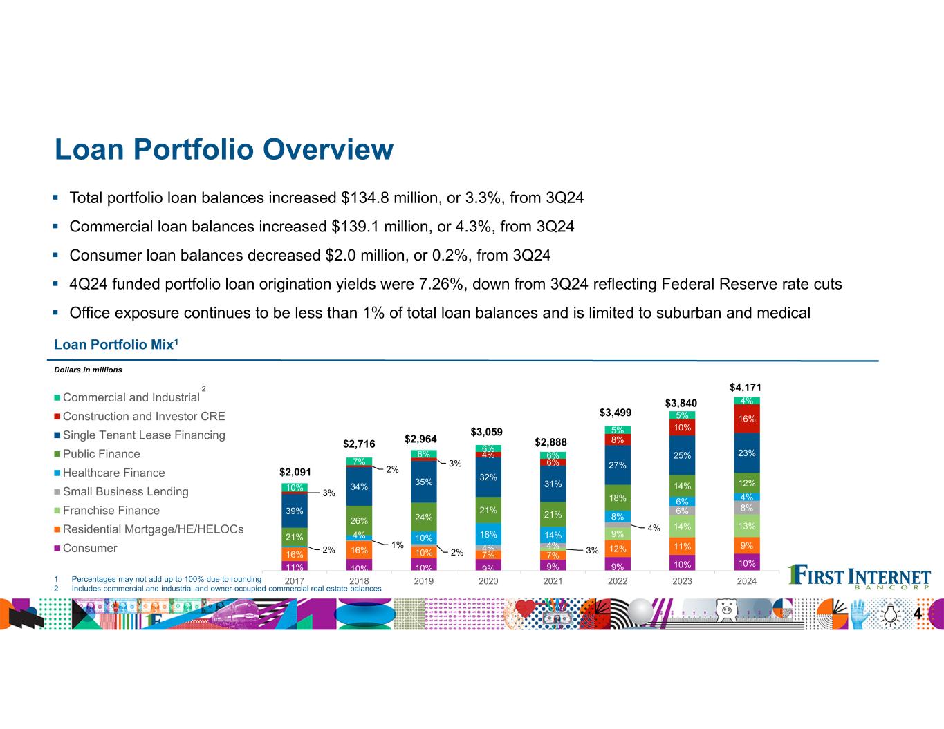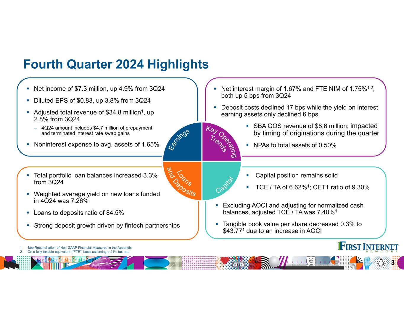 Fourth Quarter 2024 Highlights  Net income of $7.3 million, up 4.9% from 3Q24  Diluted EPS of $0.83, up 3.8% from 3Q24  Adjusted total revenue of $34.8 million1, up 2.8% from 3Q24 – 4Q24 amount includes $4.7 million of prepayment and terminated interest rate swap gains 3  Net interest margin of 1.67% and FTE NIM of 1.75%1,2, both up 5 bps from 3Q24  Deposit costs declined 17 bps while the yield on interest earning assets only declined 6 bps  SBA GOS revenue of $8.6 million; impacted by timing of originations during the quarter  NPAs to total assets of 0.50%  Excluding AOCI and adjusting for normalized cash balances, adjusted TCE / TA was 7.40%1  Tangible book value per share decreased 0.3% to $43.771 due to an increase in AOCI 1 See Reconciliation of Non-GAAP Financial Measures in the Appendix 2 On a fully-taxable equivalent ("FTE") basis assuming a 21% tax rate  Noninterest expense to avg. assets of 1.65%  Total portfolio loan balances increased 3.3% from 3Q24  Weighted average yield on new loans funded in 4Q24 was 7.26%  Loans to deposits ratio of 84.5%  Strong deposit growth driven by fintech partnerships  Capital position remains solid  TCE / TA of 6.62%1; CET1 ratio of 9.30%
