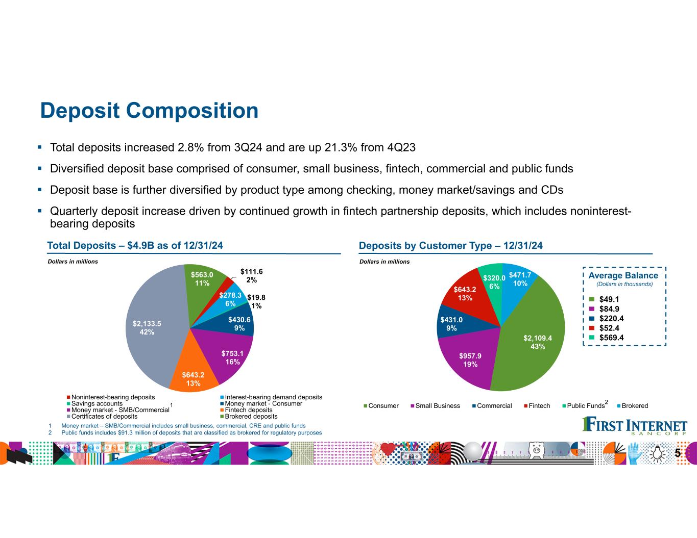 Loan Portfolio Overview  Total portfolio loan balances increased $134.8 million, or 3.3%, from 3Q24  Commercial loan balances increased $139.1 million, or 4.3%, from 3Q24  Consumer loan balances decreased $2.0 million, or 0.2%, from 3Q24  4Q24 funded portfolio loan origination yields were 7.26%, down from 3Q24 reflecting Federal Reserve rate cuts  Office exposure continues to be less than 1% of total loan balances and is limited to suburban and medical 4 Loan Portfolio Mix1 1 Percentages may not add up to 100% due to rounding 2 Includes commercial and industrial and owner-occupied commercial real estate balances Dollars in millions 2 11% 10% 10% 9% 9% 9% 10% 10% 16% 16% 10% 7% 7% 12% 11% 9%3% 9% 14% 13% 1% 2% 4% 4% 4% 6% 8% 2% 4% 10% 18% 14% 8% 6% 4% 21% 26% 24% 21% 21% 18% 14% 12% 39% 34% 35% 32% 31% 27% 25% 23% 3% 2% 3% 4% 6% 8% 10% 16% 10% 7% 6% 6% 6% 5% 5% 4% $2,091 $2,716 $2,964 $3,059 $2,888 $3,499 $3,840 $4,171 2017 2018 2019 2020 2021 2022 2023 2024 Commercial and Industrial Construction and Investor CRE Single Tenant Lease Financing Public Finance Healthcare Finance Small Business Lending Franchise Finance Residential Mortgage/HE/HELOCs Consumer