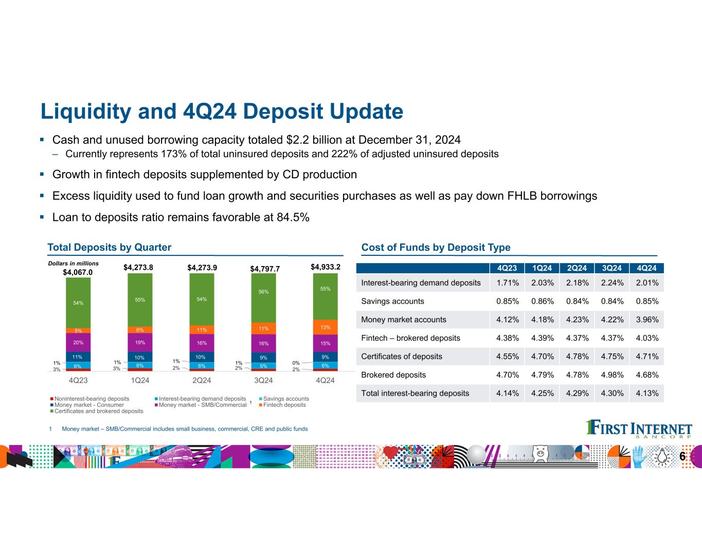 $2,109.4 43% $957.9 19% $431.0 9% $643.2 13% $320.0 6% $471.7 10% Consumer Small Business Commercial Fintech Public Funds Brokered2 $111.6 2% $278.3 6% $19.8 1% $430.6 9% $753.1 16% $643.2 13% $2,133.5 42% $563.0 11% Noninterest-bearing deposits Interest-bearing demand deposits Savings accounts Money market - Consumer Money market - SMB/Commercial Fintech deposits Certificates of deposits Brokered deposits Deposit Composition 5  Total deposits increased 2.8% from 3Q24 and are up 21.3% from 4Q23  Diversified deposit base comprised of consumer, small business, fintech, commercial and public funds  Deposit base is further diversified by product type among checking, money market/savings and CDs  Quarterly deposit increase driven by continued growth in fintech partnership deposits, which includes noninterest- bearing deposits 1 Money market – SMB/Commercial includes small business, commercial, CRE and public funds 2 Public funds includes $91.3 million of deposits that are classified as brokered for regulatory purposes 1 Deposits by Customer Type – 12/31/24 Dollars in millions Total Deposits – $4.9B as of 12/31/24 Dollars in millions Average Balance (Dollars in thousands) $49.1 $84.9 $220.4 $52.4 $569.4