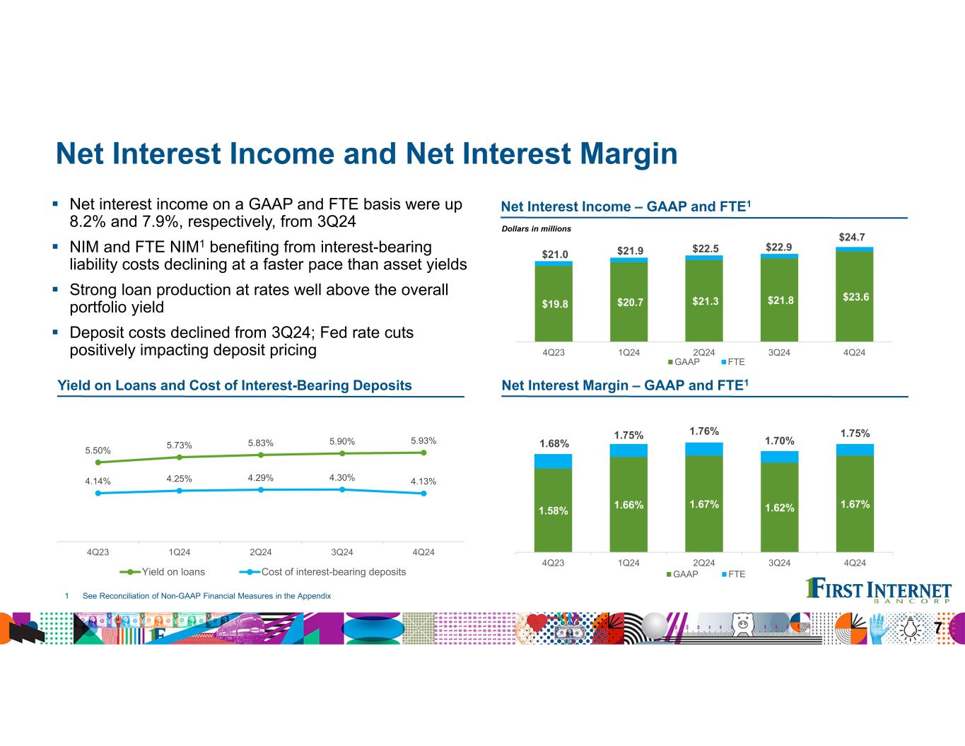 Liquidity and 4Q24 Deposit Update 6  Cash and unused borrowing capacity totaled $2.2 billion at December 31, 2024 – Currently represents 173% of total uninsured deposits and 222% of adjusted uninsured deposits  Growth in fintech deposits supplemented by CD production  Excess liquidity used to fund loan growth and securities purchases as well as pay down FHLB borrowings  Loan to deposits ratio remains favorable at 84.5% 1 Money market – SMB/Commercial includes small business, commercial, CRE and public funds Cost of Funds by Deposit TypeTotal Deposits by Quarter Dollars in millions 3% 3% 2% 2% 2%6% 6% 6% 5% 6%1% 1% 1% 1% 0% 11% 10% 10% 9% 9% 20% 19% 16% 16% 15% 5% 6% 11% 11% 13% 54% 55% 54% 56% 55% 4Q23 1Q24 2Q24 3Q24 4Q24 Noninterest-bearing deposits Interest-bearing demand deposits Savings accounts Money market - Consumer Money market - SMB/Commercial Fintech deposits Certificates and brokered deposits 1 $4,067.0 $4,273.8 $4,933.2 4Q23 1Q24 2Q24 3Q24 4Q24 Interest-bearing demand deposits 1.71% 2.03% 2.18% 2.24% 2.01% Savings accounts 0.85% 0.86% 0.84% 0.84% 0.85% Money market accounts 4.12% 4.18% 4.23% 4.22% 3.96% Fintech – brokered deposits 4.38% 4.39% 4.37% 4.37% 4.03% Certificates of deposits 4.55% 4.70% 4.78% 4.75% 4.71% Brokered deposits 4.70% 4.79% 4.78% 4.98% 4.68% Total interest-bearing deposits 4.14% 4.25% 4.29% 4.30% 4.13% $4,797.7$4,273.9
