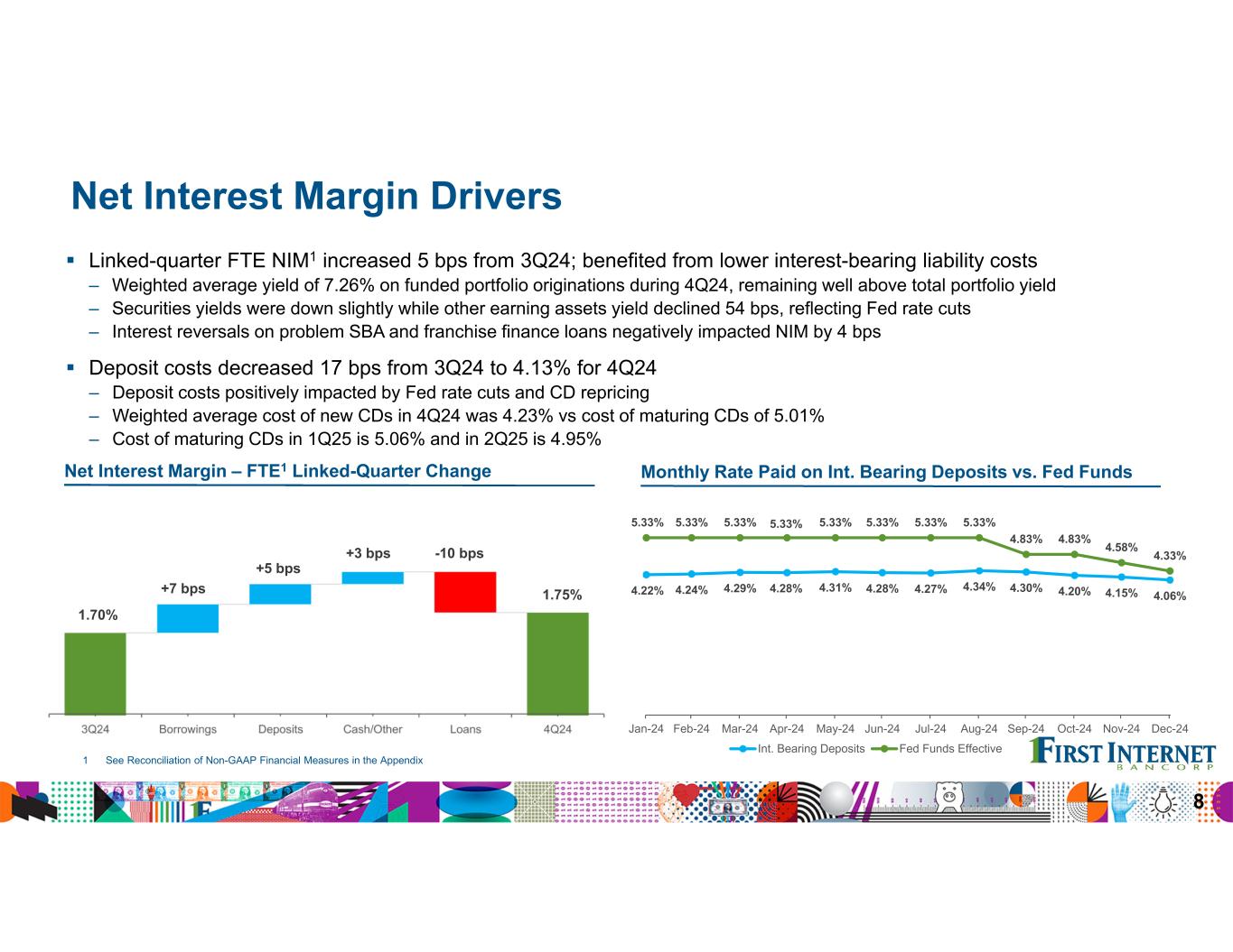 Net Interest Income and Net Interest Margin  Net interest income on a GAAP and FTE basis were up 8.2% and 7.9%, respectively, from 3Q24  NIM and FTE NIM1 benefiting from interest-bearing liability costs declining at a faster pace than asset yields  Strong loan production at rates well above the overall portfolio yield  Deposit costs declined from 3Q24; Fed rate cuts positively impacting deposit pricing 7 1 See Reconciliation of Non-GAAP Financial Measures in the Appendix Yield on Loans and Cost of Interest-Bearing Deposits Net Interest Margin – GAAP and FTE1 5.50% 5.73% 5.83% 5.90% 5.93% 4.14% 4.25% 4.29% 4.30% 4.13% 4Q23 1Q24 2Q24 3Q24 4Q24 Yield on loans Cost of interest-bearing deposits $19.8 $20.7 $21.3 $21.8 $23.6 $21.0 $21.9 $22.5 $22.9 $24.7 4Q23 1Q24 2Q24 3Q24 4Q24 GAAP FTE 1.58% 1.66% 1.67% 1.62% 1.67% 1.68% 1.75% 1.76% 1.70% 1.75% 4Q23 1Q24 2Q24 3Q24 4Q24 GAAP FTE Net Interest Income – GAAP and FTE1 Dollars in millions