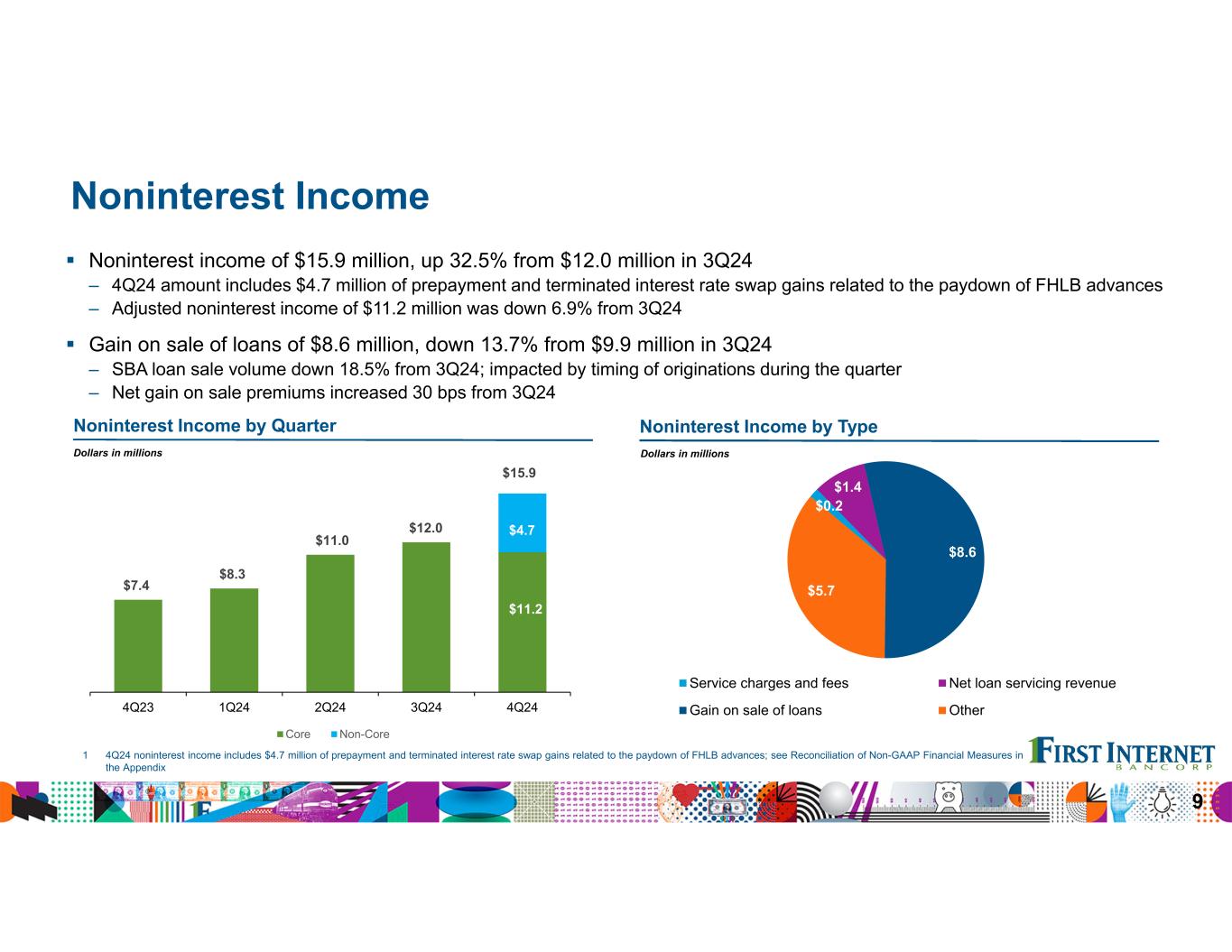 Net Interest Margin Drivers 8 1 See Reconciliation of Non-GAAP Financial Measures in the Appendix Net Interest Margin – FTE1 Linked-Quarter Change Monthly Rate Paid on Int. Bearing Deposits vs. Fed Funds  Linked-quarter FTE NIM1 increased 5 bps from 3Q24; benefited from lower interest-bearing liability costs – Weighted average yield of 7.26% on funded portfolio originations during 4Q24, remaining well above total portfolio yield – Securities yields were down slightly while other earning assets yield declined 54 bps, reflecting Fed rate cuts – Interest reversals on problem SBA and franchise finance loans negatively impacted NIM by 4 bps  Deposit costs decreased 17 bps from 3Q24 to 4.13% for 4Q24 – Deposit costs positively impacted by Fed rate cuts and CD repricing – Weighted average cost of new CDs in 4Q24 was 4.23% vs cost of maturing CDs of 5.01% – Cost of maturing CDs in 1Q25 is 5.06% and in 2Q25 is 4.95% +7 bps -10 bps+3 bps 1.70% 1.75% +5 bps 4.22% 4.24% 4.29% 4.28% 4.31% 4.28% 4.27% 4.34% 4.30% 4.20% 4.15% 4.06% 5.33% 5.33% 5.33% 5.33% 5.33% 5.33% 5.33% 5.33% 4.83% 4.83% 4.58% 4.33% Jan-24 Feb-24 Mar-24 Apr-24 May-24 Jun-24 Jul-24 Aug-24 Sep-24 Oct-24 Nov-24 Dec-24 Int. Bearing Deposits Fed Funds Effective