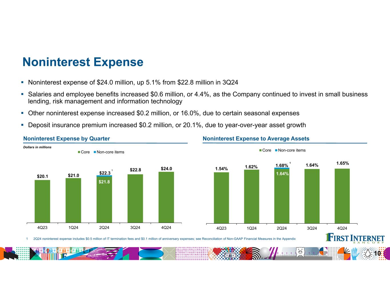 Noninterest Income 9 Dollars in millions Noninterest Income by Type Dollars in millions Noninterest Income by Quarter  Noninterest income of $15.9 million, up 32.5% from $12.0 million in 3Q24 – 4Q24 amount includes $4.7 million of prepayment and terminated interest rate swap gains related to the paydown of FHLB advances – Adjusted noninterest income of $11.2 million was down 6.9% from 3Q24  Gain on sale of loans of $8.6 million, down 13.7% from $9.9 million in 3Q24 – SBA loan sale volume down 18.5% from 3Q24; impacted by timing of originations during the quarter – Net gain on sale premiums increased 30 bps from 3Q24 $0.2 $1.4 $8.6 $5.7 Service charges and fees Net loan servicing revenue Gain on sale of loans Other $7.4 $8.3 $11.0 $12.0 $15.9 4Q23 1Q24 2Q24 3Q24 4Q24 Core Non-Core $4.7 $11.2 1 4Q24 noninterest income includes $4.7 million of prepayment and terminated interest rate swap gains related to the paydown of FHLB advances; see Reconciliation of Non-GAAP Financial Measures in the Appendix