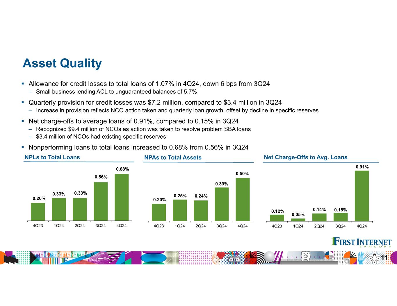 Noninterest Expense 10 1 2Q24 noninterest expense includes $0.5 million of IT termination fees and $0.1 million of anniversary expenses; see Reconciliation of Non-GAAP Financial Measures in the Appendix Dollars in millions Noninterest Expense by Quarter Noninterest Expense to Average Assets 1.73%1.71% 1.55% 1.54% 1.62% 1.68% 1.64% 1.65% 4Q23 1Q24 2Q24 3Q24 4Q24 Core Non-core items 1 1.64%$20.1 $21.0 $22.3 $22.8 $24.0 4Q23 1Q24 2Q24 3Q24 4Q24 Core Non-core items 1  Noninterest expense of $24.0 million, up 5.1% from $22.8 million in 3Q24  Salaries and employee benefits increased $0.6 million, or 4.4%, as the Company continued to invest in small business lending, risk management and information technology  Other noninterest expense increased $0.2 million, or 16.0%, due to certain seasonal expenses  Deposit insurance premium increased $0.2 million, or 20.1%, due to year-over-year asset growth $21.8