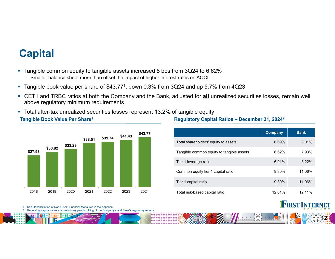 Capital  Tangible common equity to tangible assets increased 8 bps from 3Q24 to 6.62%1 – Smaller balance sheet more than offset the impact of higher interest rates on AOCI  Tangible book value per share of $43.771, down 0.3% from 3Q24 and up 5.7% from 4Q23  CET1 and TRBC ratios at both the Company and the Bank, adjusted for all unrealized securities losses, remain well above regulatory minimum requirements  Total after-tax unrealized securities losses represent 13.2% of tangible equity 12 1 See Reconciliation of Non-GAAP Financial Measures in the Appendix 2 Regulatory capital ratios are preliminary pending filing of the Company’s and Bank’s regulatory reports Company Bank Total shareholders' equity to assets 6.69% 8.01% Tangible common equity to tangible assets1 6.62% 7.93% Tier 1 leverage ratio 6.91% 8.22% Common equity tier 1 capital ratio 9.30% 11.06% Tier 1 capital ratio 9.30% 11.06% Total risk-based capital ratio 12.61% 12.11% $27.93 $30.82 $33.29 $38.51 $39.74 $41.43 $43.77 2018 2019 2020 2021 2022 2023 2024 Tangible Book Value Per Share1 Regulatory Capital Ratios – December 31, 20242