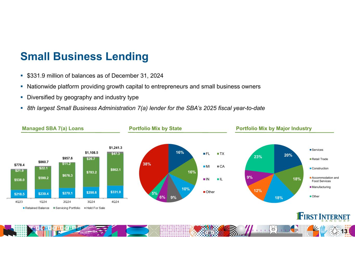Small Business Lending  $331.9 million of balances as of December 31, 2024  Nationwide platform providing growth capital to entrepreneurs and small business owners  Diversified by geography and industry type  8th largest Small Business Administration 7(a) lender for the SBA’s 2025 fiscal year-to-date 1313 Managed SBA 7(a) Loans Portfolio Mix by State Portfolio Mix by Major Industry 16% 16% 10% 9%6% 5% 38% FL TX MI CA IN IL Other 20% 18% 18% 12% 9% 23% Services Retail Trade Construction Accommodation and Food Services Manufacturing Other