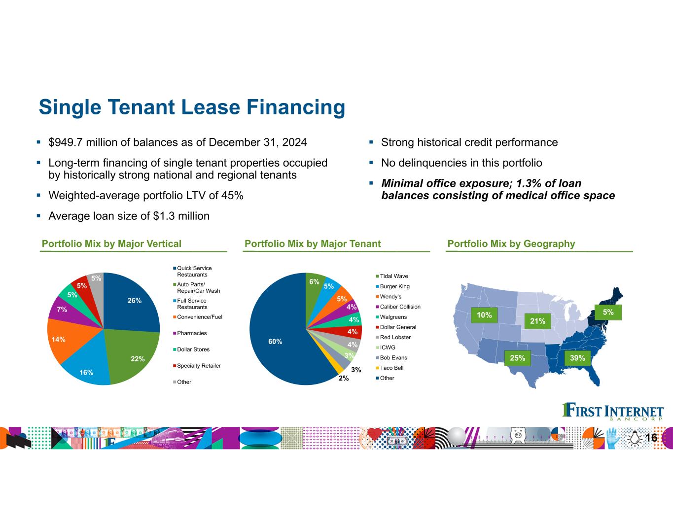 Franchise Finance  $536.9 million of balances as of December 31, 2024  Focused on providing growth financing to franchisees in a variety of industry segments  Diversified by geography, industry and brand  Average loan size of $0.8 million 15 Portfolio Mix by Borrower Use Portfolio Mix by State Portfolio Mix by Brand 131 22% 15% 13%13% 10% 5% 22% Limited-Service Restaurants Indoor Recreation Beauty Salons Snacks and Nonalcoholic Beverages Fitness and Recreational Sports Centers Other Personal Care Services Other 14% 12% 6% 5% 5% 4% 3% 51% TX CA FL PA MI GA NY Other 9% 8% 6% 6% 5% 5% 61% Urban Air Adventure Park Scooter's Coffee My Salon Suite Goldfish Swim School Jersey Mike's Restore Hyper Wellness Other