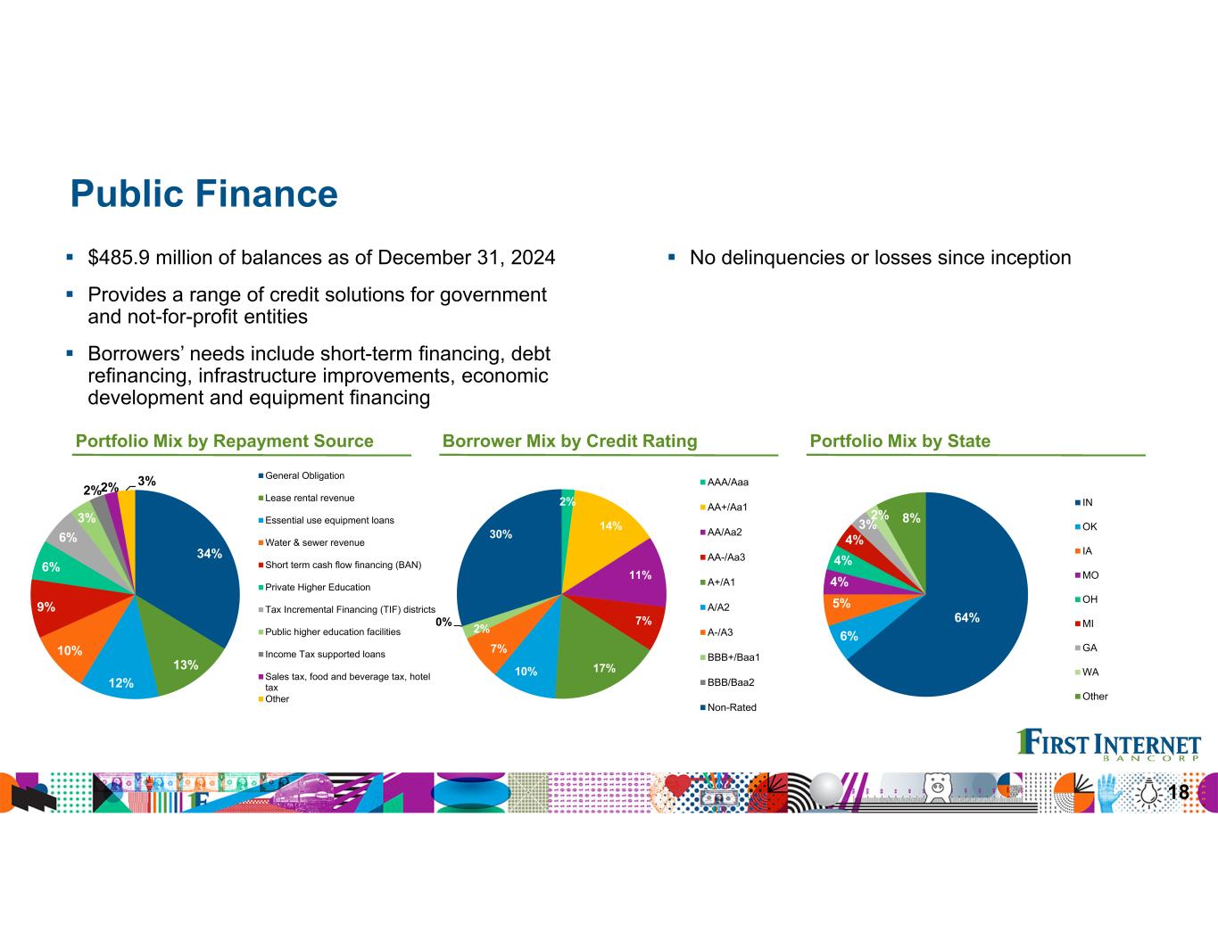 2% 14% 11% 7% 17%10% 7% 2%0% 30% AAA/Aaa AA+/Aa1 AA/Aa2 AA-/Aa3 A+/A1 A/A2 A-/A3 BBB+/Baa1 BBB/Baa2 Non-Rated 34% 13% 12% 10% 9% 6% 6% 3% 2%2% 3% General Obligation Lease rental revenue Essential use equipment loans Water & sewer revenue Short term cash flow financing (BAN) Private Higher Education Tax Incremental Financing (TIF) districts Public higher education facilities Income Tax supported loans Sales tax, food and beverage tax, hotel tax Other 64% 6% 5% 4% 4% 4% 3% 2% 8% IN OK IA MO OH MI GA WA Other Public Finance  $485.9 million of balances as of December 31, 2024  Provides a range of credit solutions for government and not-for-profit entities  Borrowers’ needs include short-term financing, debt refinancing, infrastructure improvements, economic development and equipment financing 18  No delinquencies or losses since inception Portfolio Mix by Repayment Source Borrower Mix by Credit Rating Portfolio Mix by State