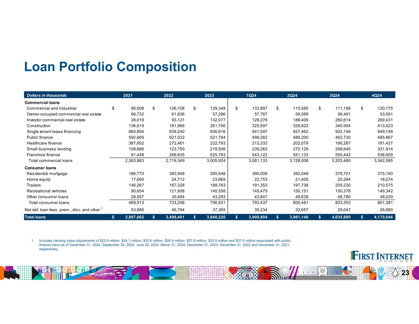 Loan Portfolio Composition 23 1 Includes carrying value adjustments of $22.9 million, $24.1 million, $25.6 million, $26.9 million, $27.8 million, $32.5 million and $37.5 million associated with public finance loans as of December 31, 2024, September 30, 2024, June 30, 2024, March 31, 2024, December 31, 2023, December 31, 2022 and December 31, 2021, respectively. Dollars in thousands 2021 2022 2023 1Q24 2Q24 3Q24 4Q24 Commercial loans Commercial and industrial 96,008$ 126,108$ 129,349$ 133,897$ 115,585$ 111,199$ 120,175$ Owner-occupied commercial real estate 66,732 61,836 57,286 57,787 58,089 56,461 53,591 Investor commercial real estate 28,019 93,121 132,077 128,276 188,409 260,614 269,431 Construction 136,619 181,966 261,750 325,597 328,922 340,954 413,523 Single tenant lease financing 865,854 939,240 936,616 941,597 927,462 932,148 949,748 Public finance 592,665 621,032 521,764 498,262 486,200 462,730 485,867 Healthcare finance 387,852 272,461 222,793 213,332 202,079 190,287 181,427 Small business lending 108,666 123,750 218,506 239,263 270,129 298,645 331,914 Franchise finance 81,448 299,835 525,783 543,122 551,133 550,442 536,909 Total commercial loans 2,363,863 2,719,349 3,005,924 3,081,133 3,128,008 3,203,480 3,342,585 Consumer loans Residential mortgage 186,770 383,948 395,648 390,009 382,549 378,701 375,160 Home equity 17,665 24,712 23,669 22,753 21,405 20,264 18,274 Trailers 146,267 167,326 188,763 191,353 197,738 205,230 210,575 Recreational vehicles 90,654 121,808 145,558 145,475 150,151 150,378 149,342 Other consumer loans 28,557 35,464 43,293 43,847 48,638 48,780 48,030 Total consumer loans 469,913 733,258 796,931 793,437 800,481 803,353 801,381 Net def. loan fees, prem., disc. and other 1 53,886 46,794 37,365 35,234 32,657 29,047 26,680 Total loans 2,887,662$ 3,499,401$ 3,840,220$ 3,909,804$ 3,961,146$ 4,035,880$ 4,170,646$