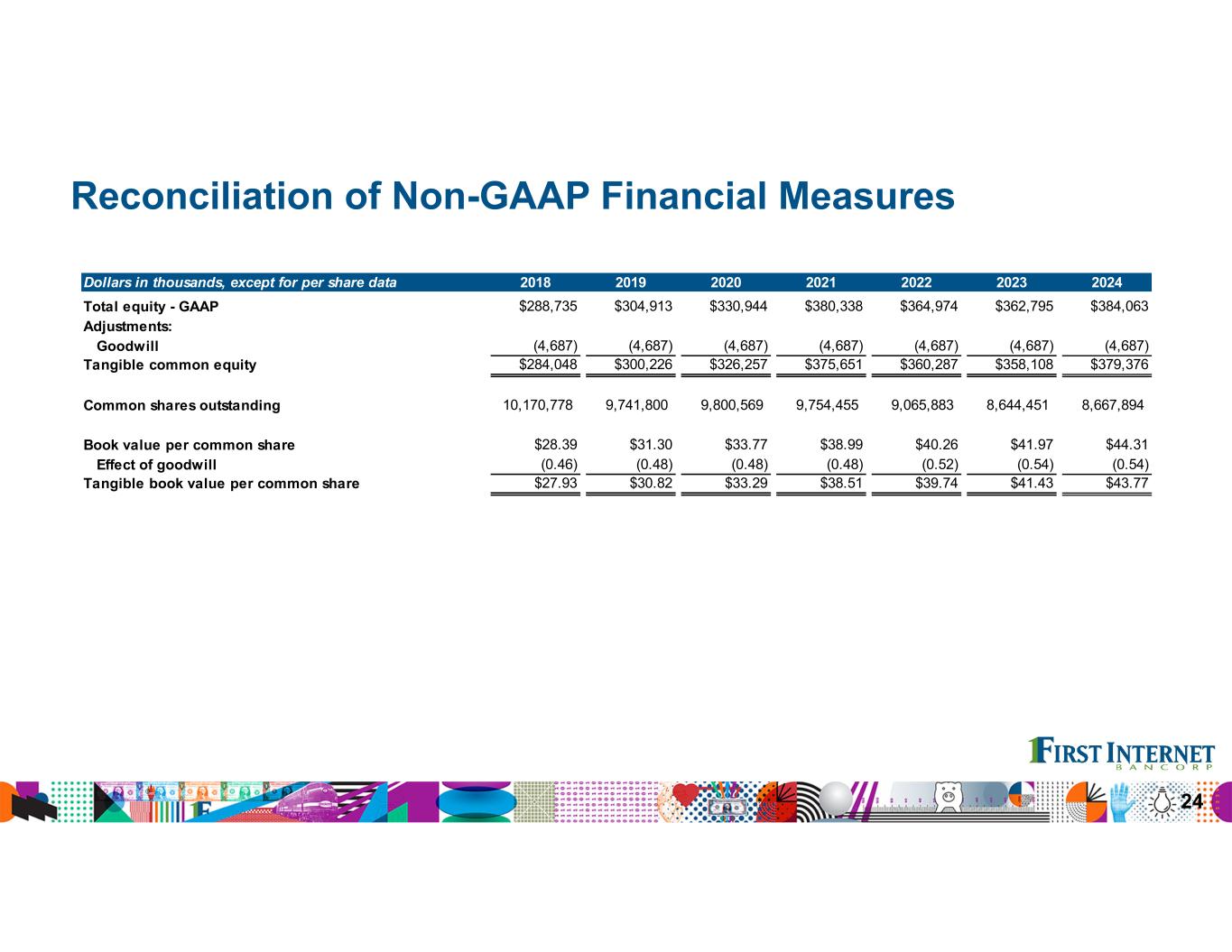 Reconciliation of Non-GAAP Financial Measures 24 Dollars in thousands, except for per share data 2018 2019 2020 2021 2022 2023 2024 Total equity - GAAP $288,735 $304,913 $330,944 $380,338 $364,974 $362,795 $384,063 Adjustments: Goodwill (4,687) (4,687) (4,687) (4,687) (4,687) (4,687) (4,687) Tangible common equity $284,048 $300,226 $326,257 $375,651 $360,287 $358,108 $379,376 Common shares outstanding 10,170,778 9,741,800 9,800,569 9,754,455 9,065,883 8,644,451 8,667,894 Book value per common share $28.39 $31.30 $33.77 $38.99 $40.26 $41.97 $44.31 Effect of goodwill (0.46) (0.48) (0.48) (0.48) (0.52) (0.54) (0.54) Tangible book value per common share $27.93 $30.82 $33.29 $38.51 $39.74 $41.43 $43.77