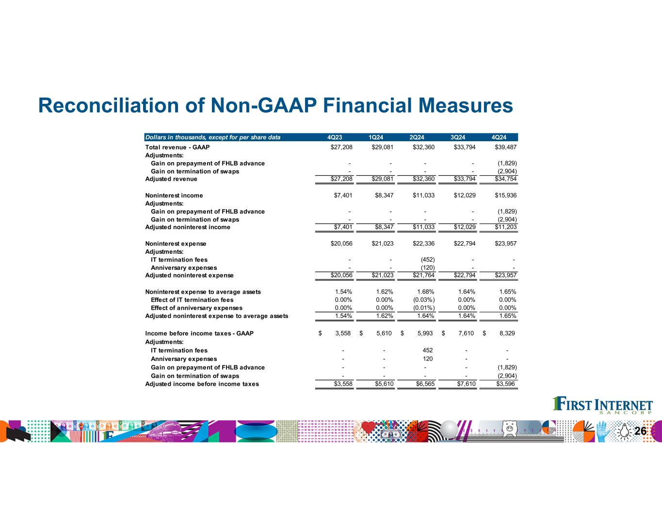 Reconciliation of Non-GAAP Financial Measures 25 1 Assuming a 21% tax rate Dollars in thousands, except for per share data 4Q23 1Q24 2Q24 3Q24 4Q24 Total equity - GAAP $362,795 $366,739 $371,953 $385,129 $384,063 Adjustments: Goodwill (4,687) (4,687) (4,687) (4,687) (4,687) Tangible common equity $358,108 $362,052 $367,266 $380,442 $379,376 Total assets - GAAP $5,167,572 $5,340,667 $5,343,302 $5,823,259 $5,737,859 Adjustments: Goodwill (4,687) (4,687) (4,687) (4,687) (4,687) Tangible assets $5,162,885 $5,335,980 $5,338,615 $5,818,572 $5,733,172 Common shares outstanding 8,644,451 8,655,854 8,667,894 8,667,894 8,667,894 Book value per common share $41.97 $42.37 $42.91 $44.43 $44.31 Effect of goodwill (0.54) (0.54) (0.54) (0.54) (0.54) Tangible book value per common share $41.43 $41.83 $42.37 $43.89 $43.77 Total shareholders' equity to assets 7.02% 6.87% 6.96% 6.61% 6.69% Effect of goodwill (0.08%) (0.08%) (0.08%) (0.07%) (0.07%) Tangible common equity to tangible assets 6.94% 6.79% 6.88% 6.54% 6.62% Total interest income $66,272 $68,165 $70,961 $74,990 $77,771 Adjustments: Fully-taxable equivalent adjustments 1 1,238 1,190 1,175 1,133 1,152 Total interest income - FTE $67,510 $69,355 $72,136 $76,123 $78,923 Net interest income $19,807 $20,734 $21,327 $21,765 $23,551 Adjustments: Fully-taxable equivalent adjustments 1 1,238 1,190 1,175 1,133 1,152 Net interest income - FTE $21,045 $21,924 $22,502 $22,898 $24,703 Net interest margin 1.58% 1.66% 1.67% 1.62% 1.67% Adjustments: Effect of fully-taxable equivalent adjustments 1 0.10% 0.09% 0.09% 0.08% 0.08% Net interest margin - FTE 1.68% 1.75% 1.76% 1.70% 1.75%