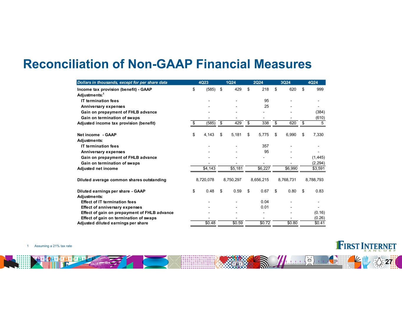 Reconciliation of Non-GAAP Financial Measures 26 Dollars in thousands, except for per share data 4Q23 1Q24 2Q24 3Q24 4Q24 Total revenue - GAAP $27,208 $29,081 $32,360 $33,794 $39,487 Adjustments: Gain on prepayment of FHLB advance - - - - (1,829) Gain on termination of swaps - - - - (2,904) Adjusted revenue $27,208 $29,081 $32,360 $33,794 $34,754 Noninterest income $7,401 $8,347 $11,033 $12,029 $15,936 Adjustments: Gain on prepayment of FHLB advance - - - - (1,829) Gain on termination of swaps - - - - (2,904) Adjusted noninterest income $7,401 $8,347 $11,033 $12,029 $11,203 Noninterest expense $20,056 $21,023 $22,336 $22,794 $23,957 Adjustments: IT termination fees - - (452) - - Anniversary expenses - - (120) - - Adjusted noninterest expense $20,056 $21,023 $21,764 $22,794 $23,957 Noninterest expense to average assets 1.54% 1.62% 1.68% 1.64% 1.65% Effect of IT termination fees 0.00% 0.00% (0.03%) 0.00% 0.00% Effect of anniversary expenses 0.00% 0.00% (0.01%) 0.00% 0.00% Adjusted noninterest expense to average assets 1.54% 1.62% 1.64% 1.64% 1.65% Income before income taxes - GAAP 3,558$ 5,610$ 5,993$ 7,610$ 8,329$ Adjustments: IT termination fees - - 452 - - Anniversary expenses - - 120 - - Gain on prepayment of FHLB advance - - - - (1,829) Gain on termination of swaps - - - - (2,904) Adjusted income before income taxes $3,558 $5,610 $6,565 $7,610 $3,596