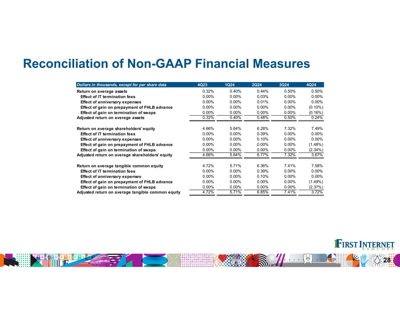 Reconciliation of Non-GAAP Financial Measures 27 1 Assuming a 21% tax rate Dollars in thousands, except for per share data 4Q23 1Q24 2Q24 3Q24 4Q24 Income tax provision (benefit) - GAAP (585)$ 429$ 218$ 620$ 999$ Adjustments:1 IT termination fees - - 95 - - Anniversary expenses - - 25 - - Gain on prepayment of FHLB advance - - - - (384) Gain on termination of swaps - - - - (610) Adjusted income tax provision (benefit) (585)$ 429$ 338$ 620$ 5$ Net income - GAAP 4,143$ 5,181$ 5,775$ 6,990$ 7,330$ Adjustments: IT termination fees - - 357 - - Anniversary expenses - - 95 - - Gain on prepayment of FHLB advance - - - - (1,445) Gain on termination of swaps - - - - (2,294) Adjusted net income $4,143 $5,181 $6,227 $6,990 $3,591 Diluted average common shares outstanding 8,720,078 8,750,297 8,656,215 8,768,731 8,788,793 Diluted earnings per share - GAAP 0.48$ 0.59$ 0.67$ 0.80$ 0.83$ Adjustments: Effect of IT termination fees - - 0.04 - - Effect of anniversary expenses - - 0.01 - - Effect of gain on prepayment of FHLB advance - - - - (0.16) Effect of gain on termination of swaps - - - - (0.26) Adjusted diluted earnings per share $0.48 $0.59 $0.72 $0.80 $0.41