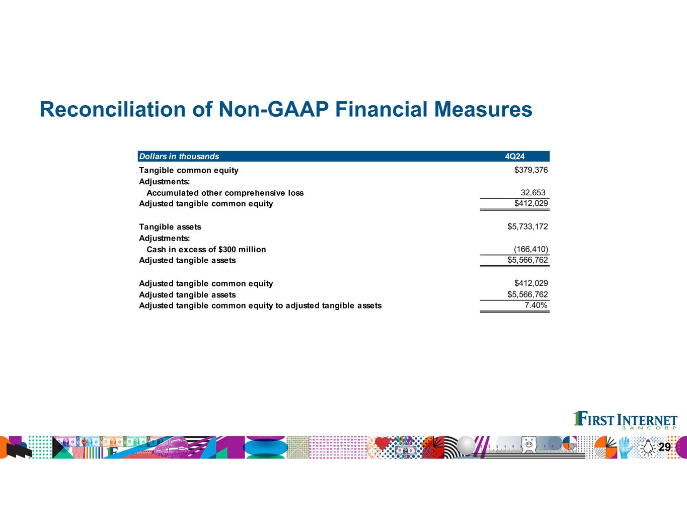 Reconciliation of Non-GAAP Financial Measures 28 Dollars in thousands, except for per share data 4Q23 1Q24 2Q24 3Q24 4Q24 Return on average assets 0.32% 0.40% 0.44% 0.50% 0.50% Effect of IT termination fees 0.00% 0.00% 0.03% 0.00% 0.00% Effect of anniversary expenses 0.00% 0.00% 0.01% 0.00% 0.00% Effect of gain on prepayment of FHLB advance 0.00% 0.00% 0.00% 0.00% (0.10%) Effect of gain on termination of swaps 0.00% 0.00% 0.00% 0.00% (0.16%) Adjusted return on average assets 0.32% 0.40% 0.48% 0.50% 0.24% Return on average shareholders' equity 4.66% 5.64% 6.28% 7.32% 7.49% Effect of IT termination fees 0.00% 0.00% 0.39% 0.00% 0.00% Effect of anniversary expenses 0.00% 0.00% 0.10% 0.00% 0.00% Effect of gain on prepayment of FHLB advance 0.00% 0.00% 0.00% 0.00% (1.48%) Effect of gain on termination of swaps 0.00% 0.00% 0.00% 0.00% (2.34%) Adjusted return on average shareholders' equity 4.66% 5.64% 6.77% 7.32% 3.67% Return on average tangible common equity 4.72% 5.71% 6.36% 7.41% 7.58% Effect of IT termination fees 0.00% 0.00% 0.39% 0.00% 0.00% Effect of anniversary expenses 0.00% 0.00% 0.10% 0.00% 0.00% Effect of gain on prepayment of FHLB advance 0.00% 0.00% 0.00% 0.00% (1.49%) Effect of gain on termination of swaps 0.00% 0.00% 0.00% 0.00% (2.37%) Adjusted return on average tangible common equity 4.72% 5.71% 6.85% 7.41% 3.72%