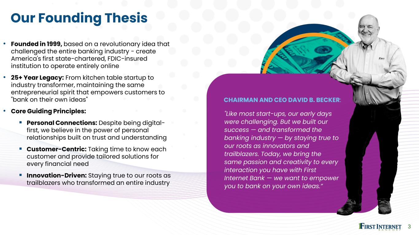 2 Forward-Looking Statements & Non-GAAP Financial Measures This presentation contains forward-looking statements within the meaning of the safe harbor provisions of the Private Securities Litigation Reform Act of 1995, including statements with respect to the financial condition, results of operations, trends in lending policies and loan programs, plans and prospective business partnerships, objectives, future performance and business of the Company. Forward-looking statements are generally identifiable by the use of words such as “believe,” “continue,” “could,” “decline,” “drive,” “enhance,” “estimate,” “expanding,” “expect,” “grow,” “growth,” “improve,” “increase,” “looking ahead,” “may,” “pending,” “plan,” “position,” “preliminary,” “remain,” “rising,” “should,” “slow,” “stable,” “strategy,” “well-positioned,” or other similar expressions. Forward-looking statements are not a guarantee of future performance or results, are based on information available at the time the statements are made and involve known and unknown risks, uncertainties and other factors that could cause actual results to differ materially from the information in the forward- looking statements. Such statements are subject to certain risks and uncertainties including: our business and operations and the business and operations of our vendors and customers; general economic conditions, whether national or regional, and conditions in the lending markets in which we participate may have an adverse effect on the demand for our loans and other products; our credit quality and related levels of nonperforming assets and loan losses, and the value and salability of the real estate that is the collateral for our loans. Other factors that may cause such differences include: failures or breaches of or interruptions in the communications and information systems on which we rely to conduct our business; failure of our plans to grow our commercial and industrial, construction and SBA loan portfolios; competition with national, regional and community financial institutions; the loss of any key members of senior management; the impacts of inflation and rising interest rates on the general economy; risks relating to the regulation of financial institutions; and other factors identified in reports we file with the U.S. Securities and Exchange Commission. All statements in this presentation, including forward-looking statements, speak only as of the date they are made, and the Company undertakes no obligation to update any statement in light of new information or future events. This presentation contains financial information determined by methods other than in accordance with U.S. generally accepted accounting principles (“GAAP”). Non-GAAP financial measures, specifically tangible common equity, tangible assets, tangible book value per common share, tangible common equity to tangible assets, total interest income – FTE, net interest income – FTE, net interest margin – FTE, adjusted revenue, pre-provision net revenue (loss), adjusted pre-provision net revenue, adjusted noninterest income, adjusted income (loss) before income taxes, adjusted income tax provision (benefit), adjusted net income (loss), adjusted diluted earnings per share, adjusted return on average assets, adjusted return on average shareholders’ equity, adjusted return on average tangible common equity, adjusted tangible common equity, adjusted tangible assets and adjusted tangible common equity to adjusted tangible assets are used by the Company’s management to measure the strength of its capital and analyze profitability, including its ability to generate earnings on tangible capital invested by its shareholders. Although management believes these non-GAAP measures are useful to investors by providing a greater understanding of its business, they should not be considered a substitute for financial measures determined in accordance with GAAP, nor are they necessarily comparable to non-GAAP performance measures that may be presented by other companies. Reconciliations of these non-GAAP financial measures to the most directly comparable GAAP financial measures are included in the table at the end of this presentation under the caption “Reconciliation of Non-GAAP Financial Measures.”