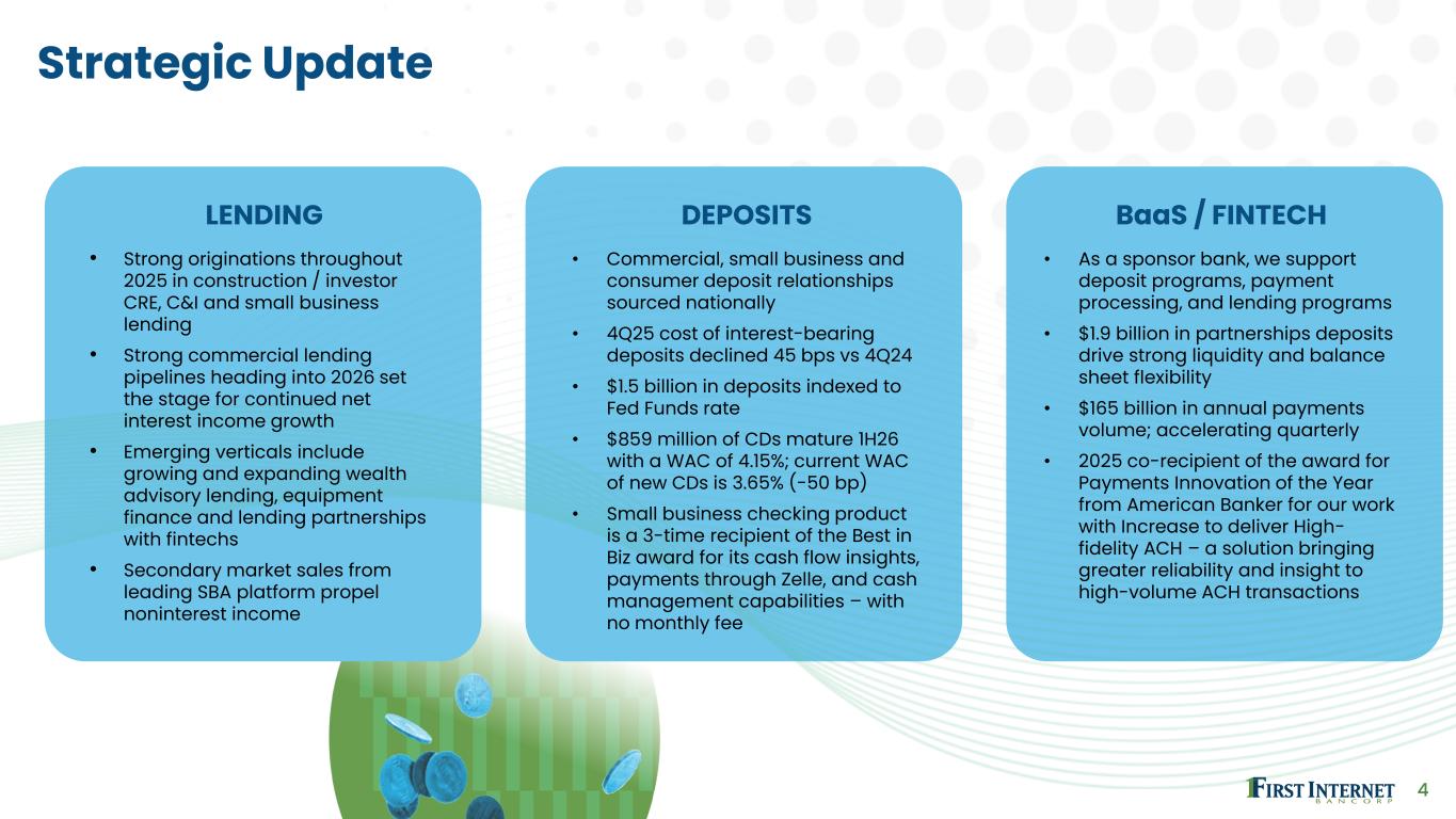 3 Our Founding Thesis • Founded in 1999, based on a revolutionary idea that challenged the entire banking industry - create America's first state-chartered, FDIC-insured institution to operate entirely online • 25+ Year Legacy: From kitchen table startup to industry transformer, maintaining the same entrepreneurial spirit that empowers customers to "bank on their own ideas" • Core Guiding Principles: ▪ Personal Connections: Despite being digital- first, we believe in the power of personal relationships built on trust and understanding ▪ Customer-Centric: Taking time to know each customer and provide tailored solutions for every financial need ▪ Innovation-Driven: Staying true to our roots as trailblazers who transformed an entire industry "Like most start-ups, our early days were challenging. But we built our success — and transformed the banking industry — by staying true to our roots as innovators and trailblazers. Today, we bring the same passion and creativity to every interaction you have with First Internet Bank — we want to empower you to bank on your own ideas.” CHAIRMAN AND CEO DAVID B. BECKER: