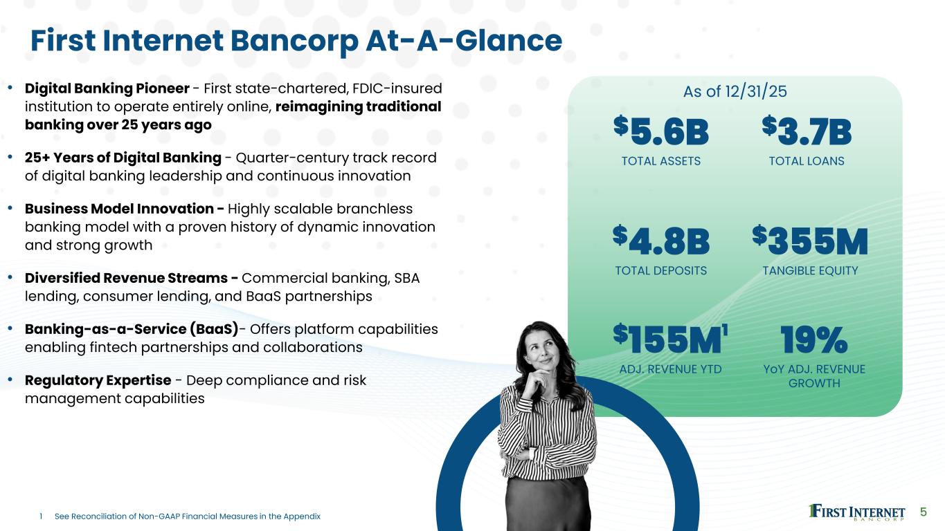 4 Strategic Update LENDING • Strong originations throughout 2025 in construction / investor CRE, C&I and small business lending • Strong commercial lending pipelines heading into 2026 set the stage for continued net interest income growth • Emerging verticals include growing and expanding wealth advisory lending, equipment finance and lending partnerships with fintechs • Secondary market sales from leading SBA platform propel noninterest income DEPOSITS • Commercial, small business and consumer deposit relationships sourced nationally • 4Q25 cost of interest-bearing deposits declined 45 bps vs 4Q24 • $1.5 billion in deposits indexed to Fed Funds rate • $859 million of CDs mature 1H26 with a WAC of 4.15%; current WAC of new CDs is 3.65% (-50 bp) • Small business checking product is a 3-time recipient of the Best in Biz award for its cash flow insights, payments through Zelle, and cash management capabilities – with no monthly fee BaaS / FINTECH • As a sponsor bank, we support deposit programs, payment processing, and lending programs • $1.9 billion in partnerships deposits drive strong liquidity and balance sheet flexibility • $165 billion in annual payments volume; accelerating quarterly • 2025 co-recipient of the award for Payments Innovation of the Year from American Banker for our work with Increase to deliver High- fidelity ACH – a solution bringing greater reliability and insight to high-volume ACH transactions