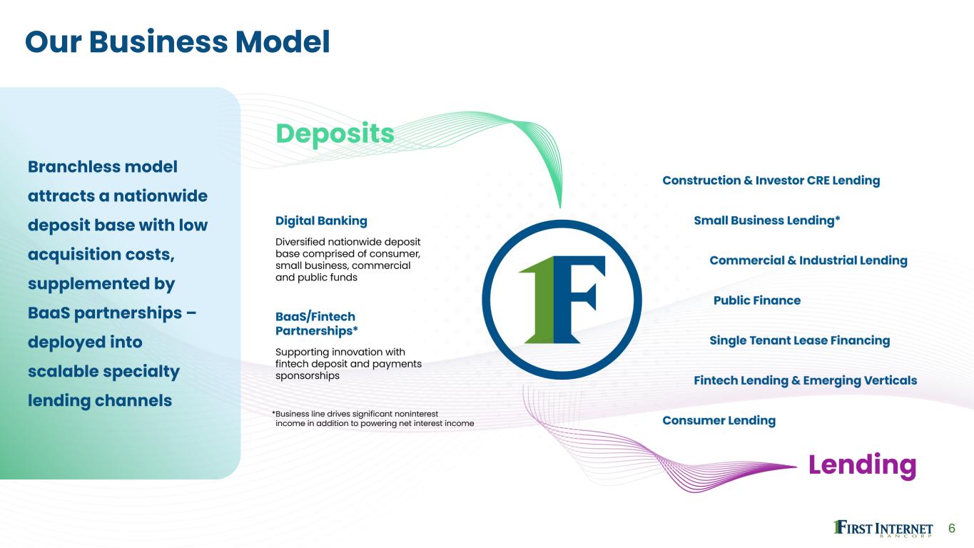 5 First Internet Bancorp At-A-Glance • Digital Banking Pioneer - First state-chartered, FDIC-insured institution to operate entirely online, reimagining traditional banking over 25 years ago • 25+ Years of Digital Banking - Quarter-century track record of digital banking leadership and continuous innovation • Business Model Innovation - Highly scalable branchless banking model with a proven history of dynamic innovation and strong growth • Diversified Revenue Streams - Commercial banking, SBA lending, consumer lending, and BaaS partnerships • Banking-as-a-Service (BaaS)- Offers platform capabilities enabling fintech partnerships and collaborations • Regulatory Expertise - Deep compliance and risk management capabilities $5.6B TOTAL ASSETS 19% YoY ADJ. REVENUE GROWTH $155M1 ADJ. REVENUE YTD $3.7B TOTAL LOANS $4.8B TOTAL DEPOSITS $355M TANGIBLE EQUITY As of 12/31/25 1 See Reconciliation of Non-GAAP Financial Measures in the Appendix