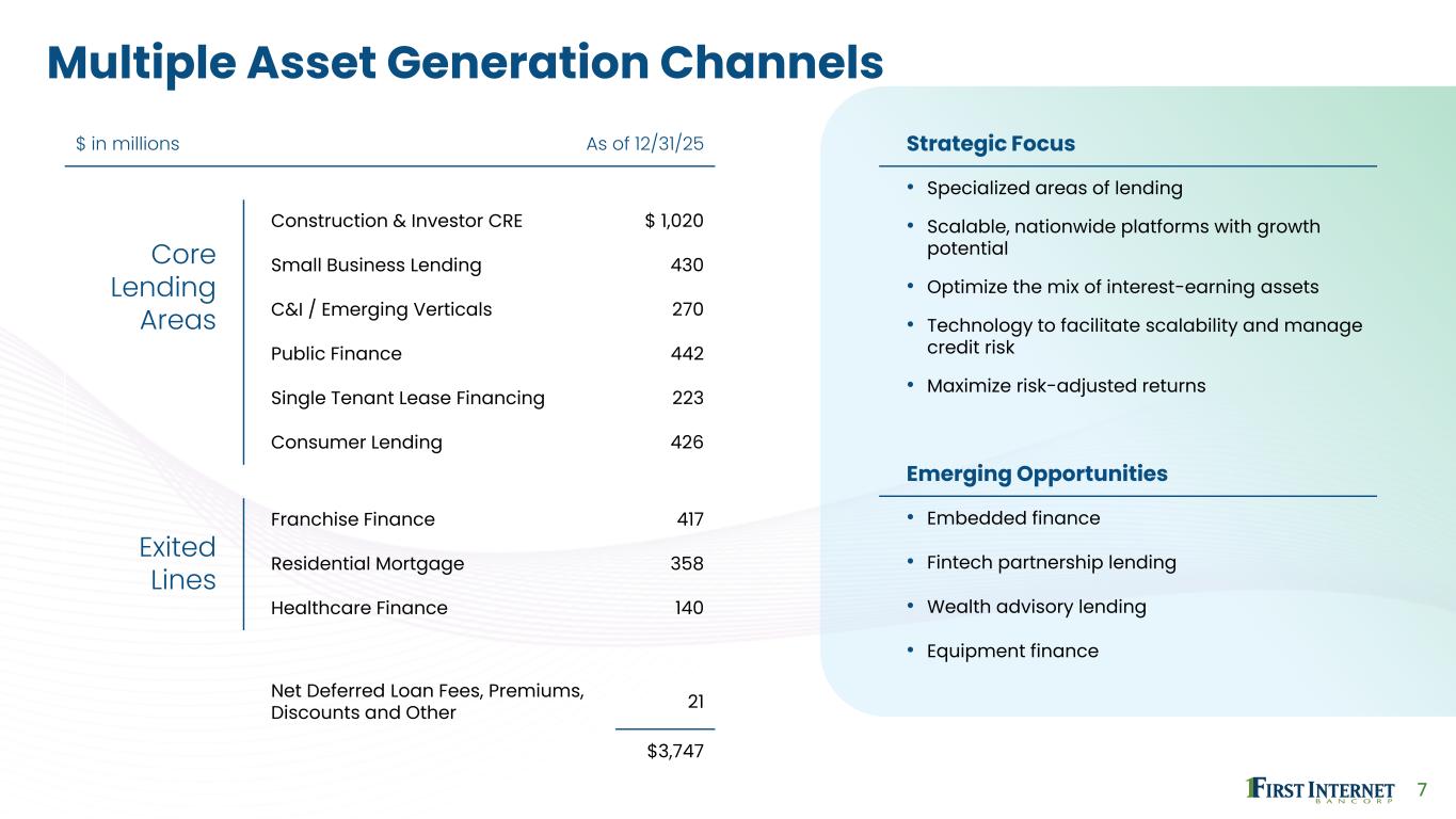6 Our Business Model Branchless model attracts a nationwide deposit base with low acquisition costs, supplemented by BaaS partnerships – deployed into scalable specialty lending channels