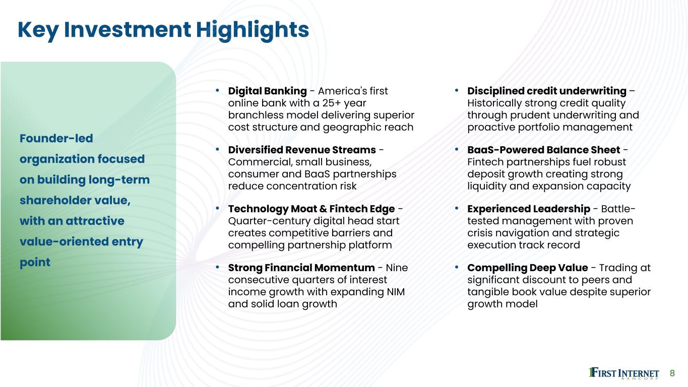 7 Multiple Asset Generation Channels $ in millions As of 12/31/25 Core Lending Areas Construction & Investor CRE $ 1,020 Small Business Lending 430 C&I / Emerging Verticals 270 Public Finance 442 Single Tenant Lease Financing 223 Consumer Lending 426 Exited Lines Franchise Finance 417 Residential Mortgage 358 Healthcare Finance 140 Net Deferred Loan Fees, Premiums, Discounts and Other 21 $3,747 Strategic Focus • Specialized areas of lending • Scalable, nationwide platforms with growth potential • Optimize the mix of interest-earning assets • Technology to facilitate scalability and manage credit risk • Maximize risk-adjusted returns Emerging Opportunities • Embedded finance • Fintech partnership lending • Wealth advisory lending • Equipment finance