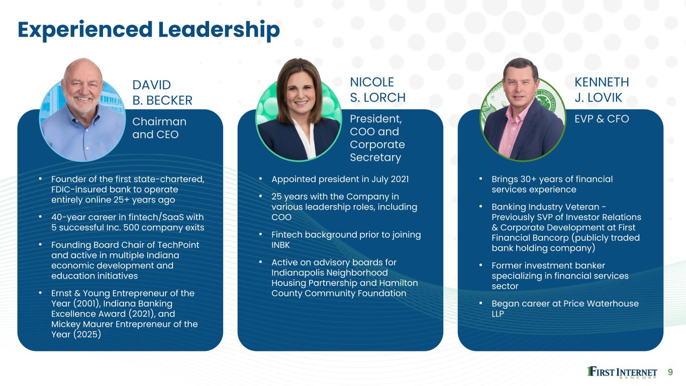 8 Key Investment Highlights • Digital Banking - America's first online bank with a 25+ year branchless model delivering superior cost structure and geographic reach • Diversified Revenue Streams - Commercial, small business, consumer and BaaS partnerships reduce concentration risk • Technology Moat & Fintech Edge - Quarter-century digital head start creates competitive barriers and compelling partnership platform • Strong Financial Momentum - Nine consecutive quarters of interest income growth with expanding NIM and solid loan growth • Disciplined credit underwriting – Historically strong credit quality through prudent underwriting and proactive portfolio management • BaaS-Powered Balance Sheet - Fintech partnerships fuel robust deposit growth creating strong liquidity and expansion capacity • Experienced Leadership - Battle- tested management with proven crisis navigation and strategic execution track record • Compelling Deep Value - Trading at significant discount to peers and tangible book value despite superior growth model Founder-led organization focused on building long-term shareholder value, with an attractive value-oriented entry point