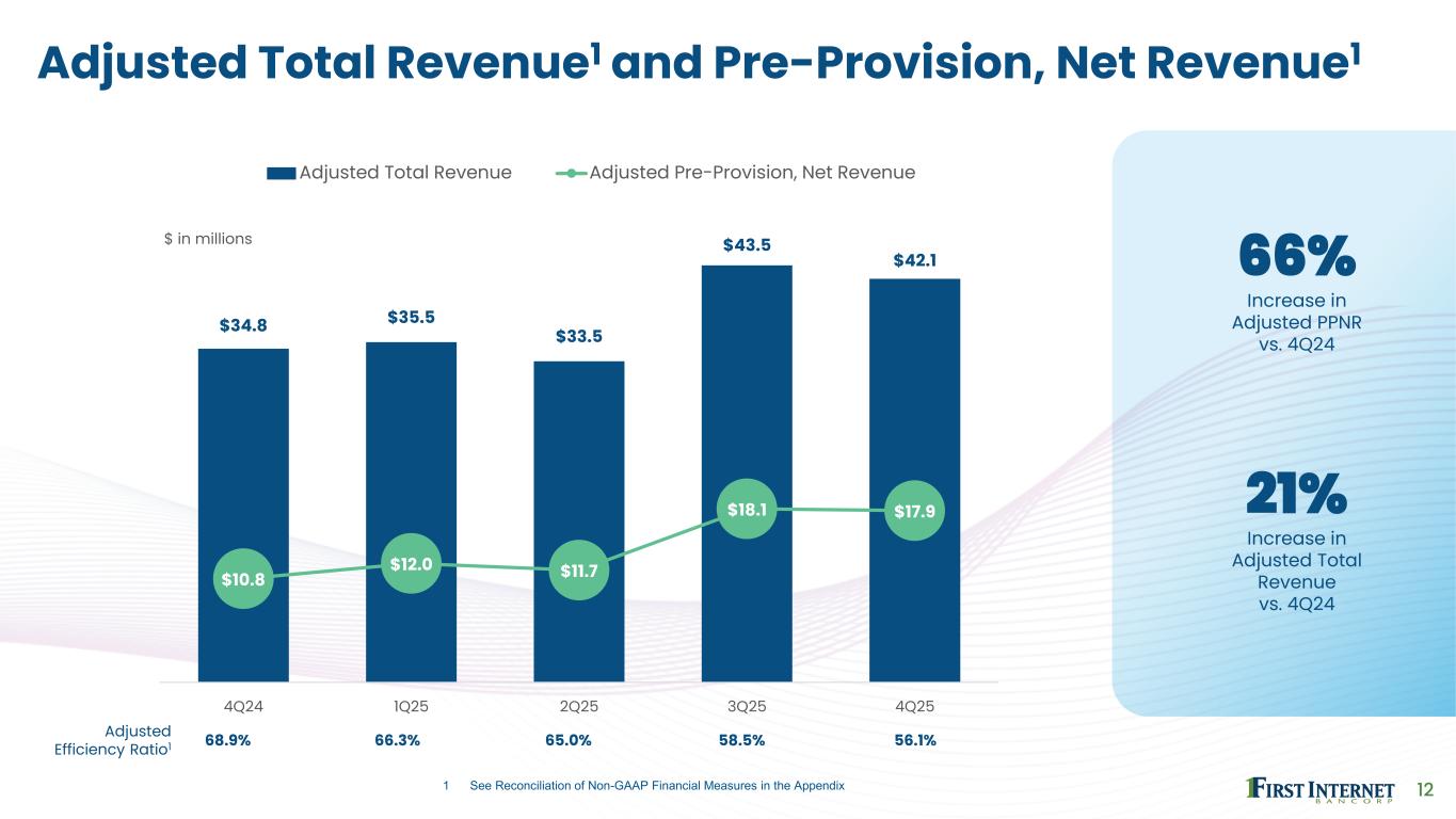 11 Fourth Quarter 2025 Highlights Earnings • Net income of $5.3 million and diluted EPS of $0.60 • Adjusted net income of $5.6 million1 and adjusted diluted EPS of $0.641 • 4Q25 results included a pre-tax loss of $0.4 million on add’l sale of STL loans related to large sale in 3Q25 NII and NIM • Net interest income of $30.3 million and FTE NII of $31.5 million1, up 29% and 27% over 4Q24 • Net interest margin and FTE NIM of 2.22% and 2.30%1, both up 55 bps from 4Q24 Revenue and PPNR • Total revenue of $41.7 million and adjusted total revenue of $42.1 million1, up 6% and 21% over 4Q24 • Pre-provision net revenue of $17.5 million1 and adjusted PPNR of $17.9 million1, up 13% and 66% over 4Q24 Loans • Total loan balances of $3.7 billion, up 4% from 3Q25 • Weighted average yield on new loans funded in 4Q25 was 6.85% • SBA GOS revenue of $8.6 million; sold $110.3 million of 7(a) guaranteed balances Credit • Provision for credit losses of $12.0 million, down 66% from 3Q25 • Net charge-offs / average loans of 1.68%, down from 1.89% in 3Q25 • NPLs / total loans of 1.56%, or 1.20% excluding guaranteed balances Capital • TCE / TA of 6.38%1, CET1 of 8.93%, total capital of 12.44% • Excluding AOCI and adjusting for normalized cash balances, adjusted TCE / TA of 6.94%1 • Tangible book value per share of $40.871, up 2.5% from 3Q25 1 See Reconciliation of Non-GAAP Financial Measures in the Appendix 2 On a fully-taxable equivalent ("FTE") basis assuming a 21% tax rate