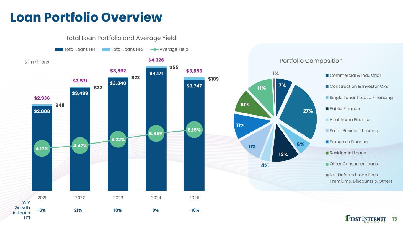 12 Adjusted Total Revenue1 and Pre-Provision, Net Revenue1 $34.8 $35.5 $33.5 $43.5 $42.1 $10.8 $12.0 $11.7 $18.1 $17.9 4Q24 1Q25 2Q25 3Q25 4Q25 Adjusted Total Revenue Adjusted Pre-Provision, Net Revenue Adjusted Efficiency Ratio1 68.9% 66.3% 65.0% 58.5% 56.1% 66% Increase in Adjusted PPNR vs. 4Q24 21% Increase in Adjusted Total Revenue vs. 4Q24 $ in millions 1 See Reconciliation of Non-GAAP Financial Measures in the Appendix