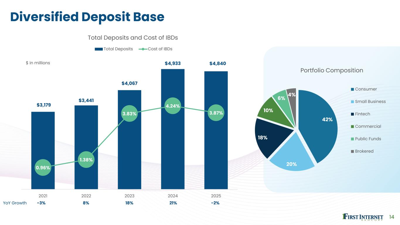 13 Loan Portfolio Overview $2,888 $3,499 $3,840 $4,171 $3,747 $48 $22 $22 $55 $109 $2,936 $3,521 $3,862 $4,226 $3,856 4.12% 4.47% 5.22% 5.85% 6.15% 2021 2022 2023 2024 2025 Total Loan Portfolio and Average Yield Total Loans HFI Total Loans HFS Average Yield 7% 27% 6% 12% 4% 11% 11% 10% 11% 1% Portfolio Composition Commercial & Industrial Construction & Investor CRE Single Tenant Lease Financing Public Finance Healthcare Finance Small Business Lending Franchise Finance Residential Loans Other Consumer Loans Net Deferred Loan Fees, Premiums, Discounts & Others YoY Growth in Loans HFI -6% 21% 10% 9% -10% $ in millions