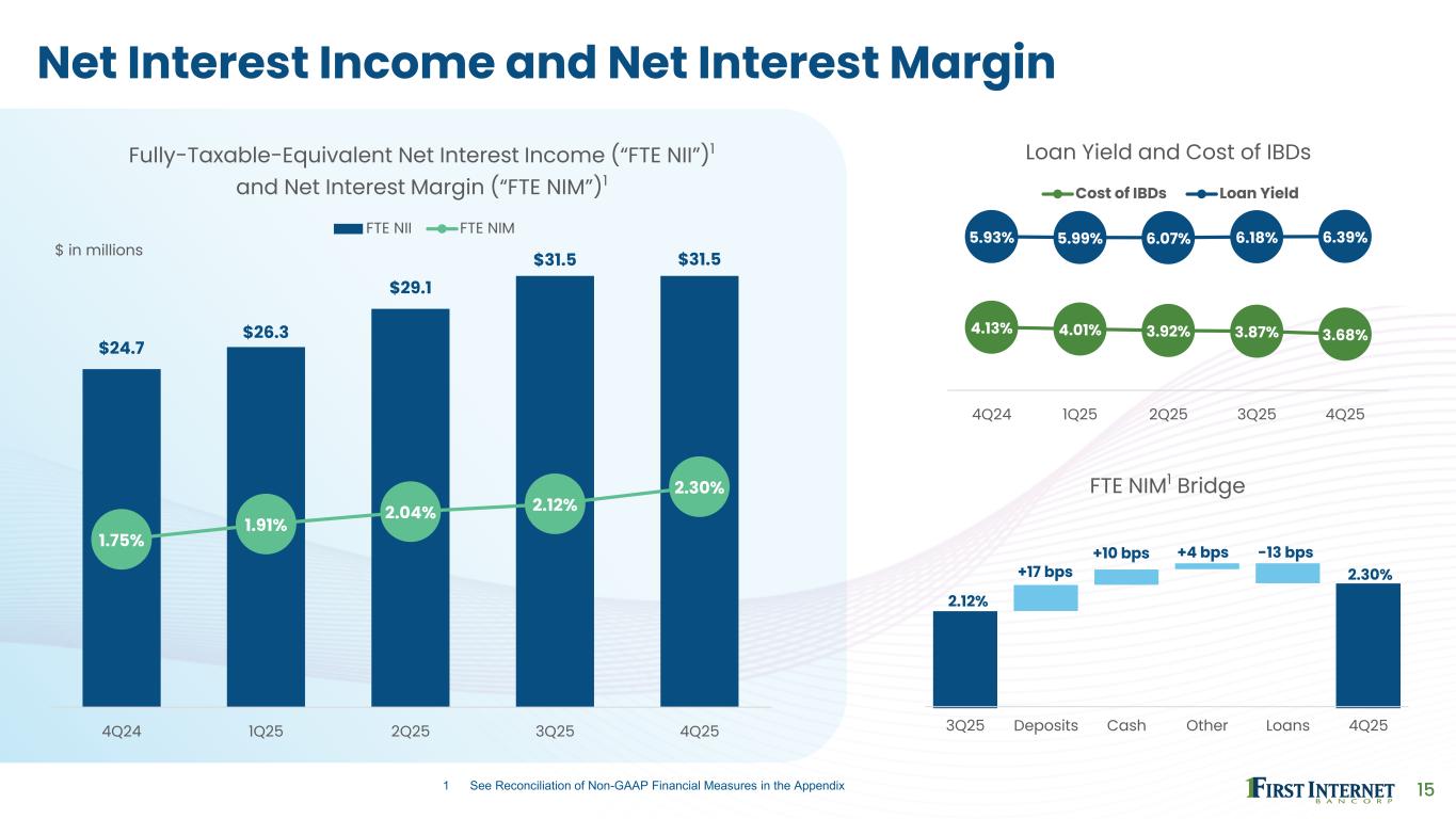 14 Diversified Deposit Base YoY Growth -3% 8% 18% 21% -2% $3,179 $3,441 $4,067 $4,933 $4,840 0.96% 1.38% 3.83% 4.24% 3.87% 2021 2022 2023 2024 2025 Total Deposits and Cost of IBDs Total Deposits Cost of IBDs 42% 20% 18% 10% 6% 4% Portfolio Composition Consumer Small Business Fintech Commercial Public Funds Brokered $ in millions