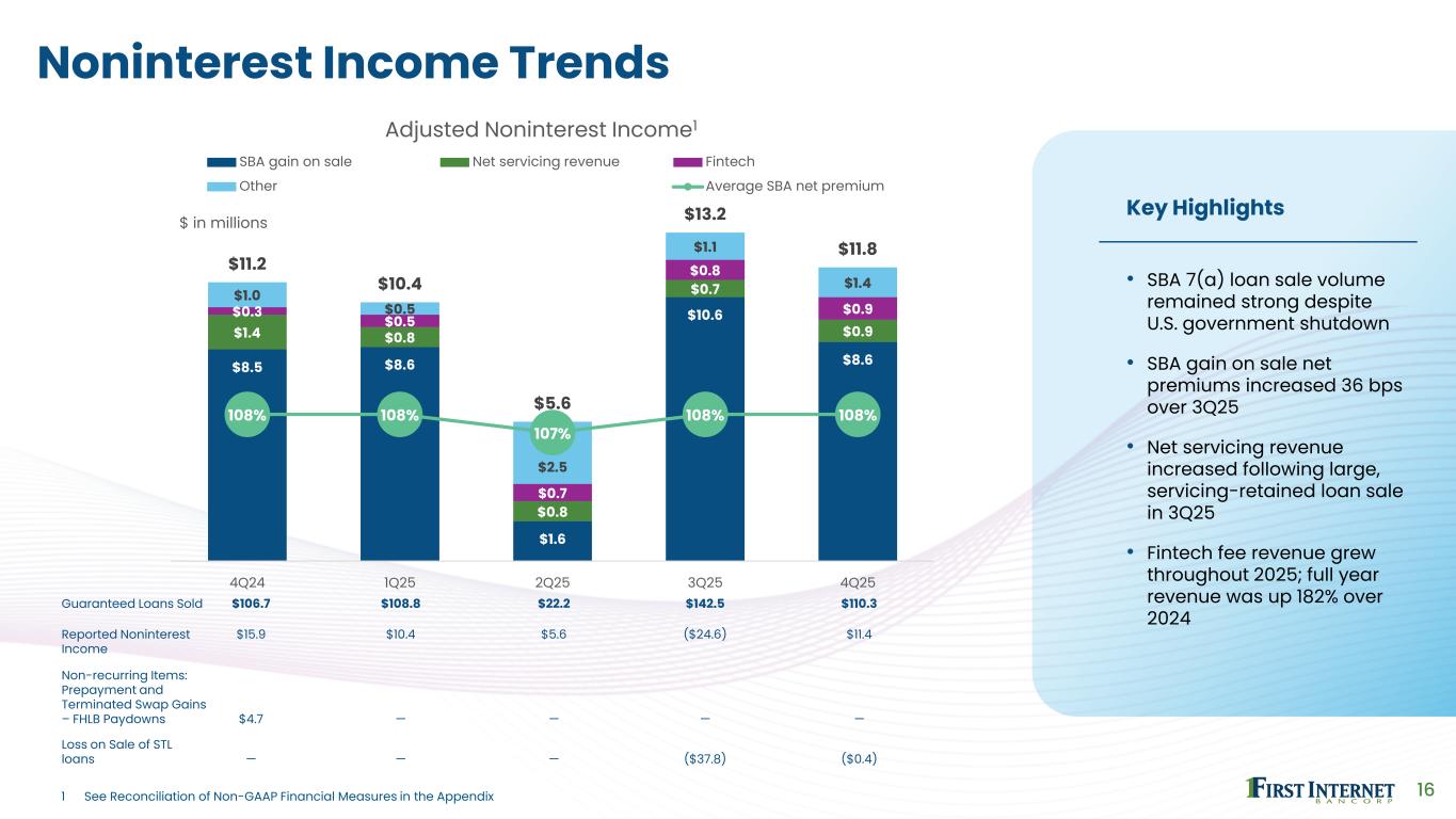 15 $24.7 $26.3 $29.1 $31.5 $31.5 1.75% 1.91% 2.04% 2.12% 2.30% 4Q24 1Q25 2Q25 3Q25 4Q25 Fully-Taxable-Equivalent Net Interest Income (“FTE NII”)1 and Net Interest Margin (“FTE NIM”)1 FTE NII FTE NIM 4.13% 4.01% 3.92% 3.87% 3.68% 5.93% 5.99% 6.07% 6.18% 6.39% 4Q24 1Q25 2Q25 3Q25 4Q25 Loan Yield and Cost of IBDs Cost of IBDs Loan Yield 3Q25 Deposits Cash Other Loans 4Q25 Net Interest Income and Net Interest Margin 2.12% +10 bps +4 bps -13 bps 2.30%+17 bps FTE NIM1 Bridge $ in millions 1 See Reconciliation of Non-GAAP Financial Measures in the Appendix