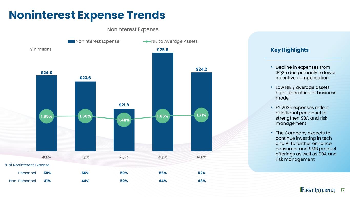 16 Noninterest Income Trends Guaranteed Loans Sold $106.7 $108.8 $22.2 $142.5 $110.3 Reported Noninterest Income $15.9 $10.4 $5.6 ($24.6) $11.4 Non-recurring Items: Prepayment and Terminated Swap Gains – FHLB Paydowns $4.7 — — — — Loss on Sale of STL loans — — — ($37.8) ($0.4) Key Highlights • SBA 7(a) loan sale volume remained strong despite U.S. government shutdown • SBA gain on sale net premiums increased 36 bps over 3Q25 • Net servicing revenue increased following large, servicing-retained loan sale in 3Q25 • Fintech fee revenue grew throughout 2025; full year revenue was up 182% over 2024 $8.5 $8.6 $1.6 $10.6 $8.6 $1.4 $0.8 $0.8 $0.7 $0.9 $0.3 $0.5 $0.7 $0.8 $0.9 $1.0 $0.5 $2.5 $1.1 $1.4 $11.2 $10.4 $5.6 $13.2 $11.8 108% 108% 107% 108% 108% 4Q24 1Q25 2Q25 3Q25 4Q25 Adjusted Noninterest Income1 SBA gain on sale Net servicing revenue Fintech Other Average SBA net premium 1 See Reconciliation of Non-GAAP Financial Measures in the Appendix $ in millions