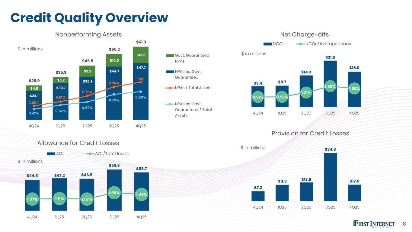 17 Noninterest Expense Trends $24.0 $23.6 $21.8 $25.5 $24.2 1.65% 1.66% 1.48% 1.66% 1.71% 4Q24 1Q25 2Q25 3Q25 4Q25 Noninterest Expense Noninterest Expense NIE to Average Assets % of Noninterest Expense Personnel 59% 56% 50% 56% 52% Non-Personnel 41% 44% 50% 44% 48% $ in millions Key Highlights • Decline in expenses from 3Q25 due primarily to lower incentive compensation • Low NIE / average assets highlights efficient business model • FY 2025 expenses reflect additional personnel to strengthen SBA and risk management • The Company expects to continue investing in tech and AI to further enhance consumer and SMB product offerings as well as SBA and risk management